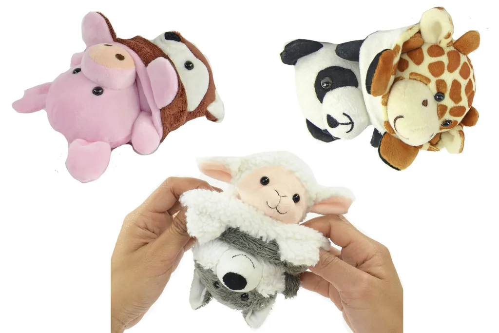 Zwei süße Plüschtiere in Einem. Stülpe den hinteren Stoffteil des Tieres einfach über den Kopf und im Handumdrehen hast du ein komplett anderes Plüschtier herbeigezaubert.