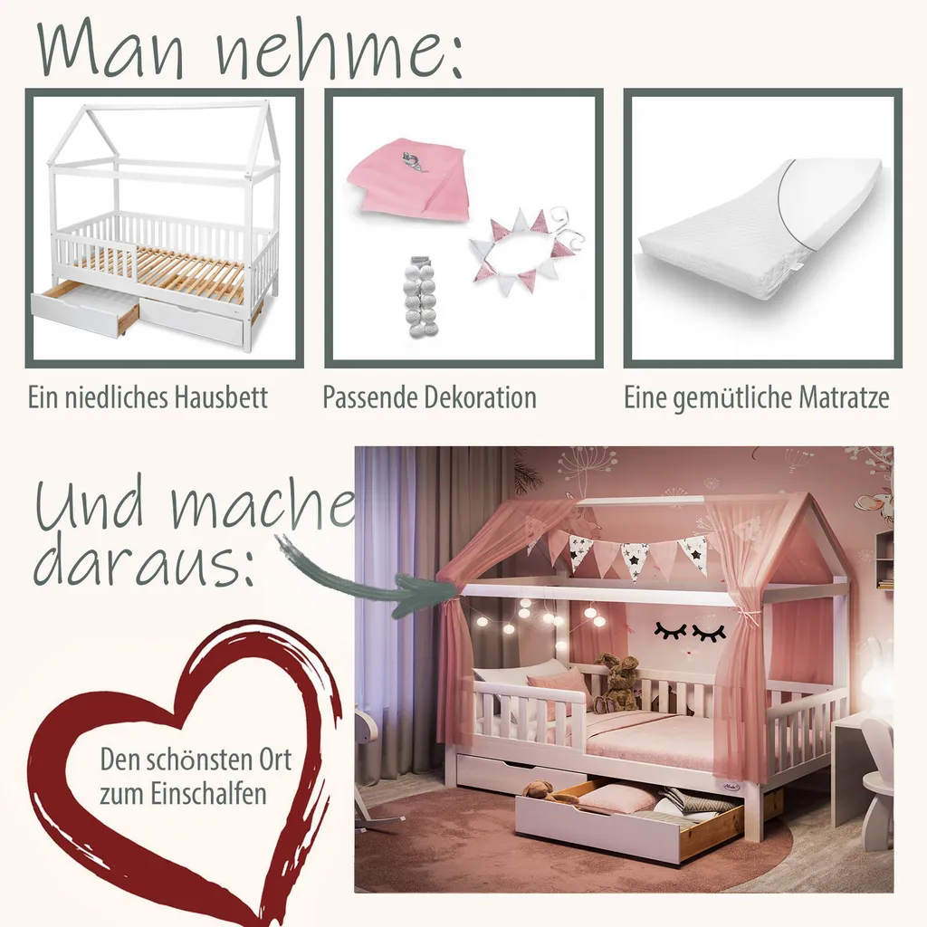 Set: Das Traumhaus für jedes Kind mit passender Matratze, Deko in rosa und praktischer Schublade, die viel Stauraum bietet und für Ordnung im Kinderzimmer sorgt.