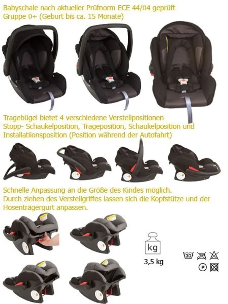 - Babyschale Protect, zugelassen nach der aktuellen staatlich/europäischen Norm 44-4 von Geburt bis ca. 13 Monte oder einem Gewicht von 0 – 13 kg
