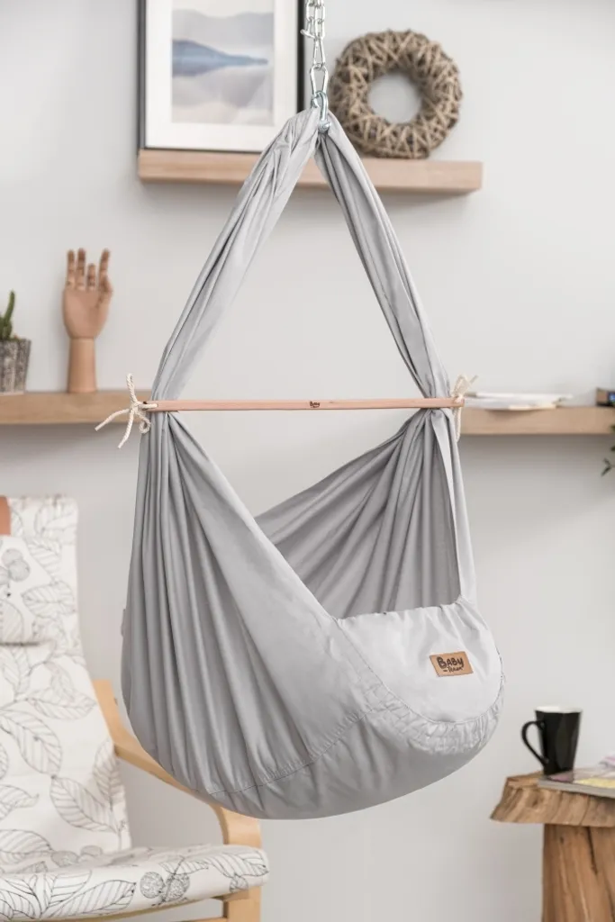 Lieferumfang: Wiegensack, Matratze, Tragetasche, Spezialfeder mit Sicherheitsseil, Spreizstab, Verlängerungskette (ca. 100 cm), Dübel, Ösenschraube, 2 Karabinerhaken, Montageanleitung mit Sicherheitshinweisen uvm.