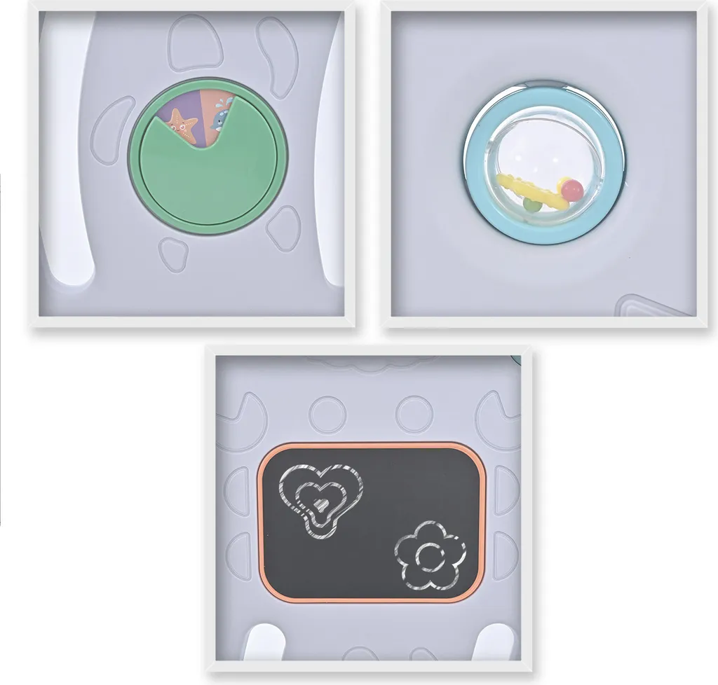 - Ein Türelement und ein Element mit integriertem Spielzeug inklusiver schwarzer Tafel