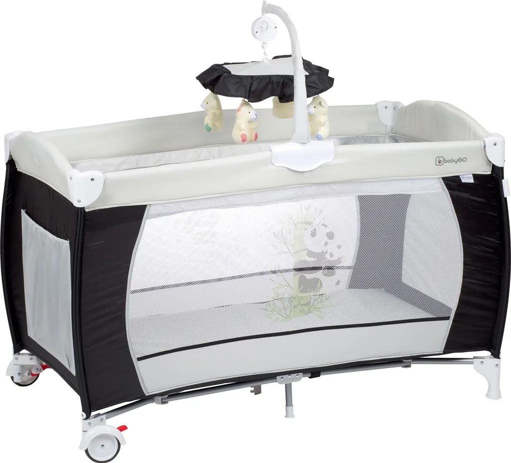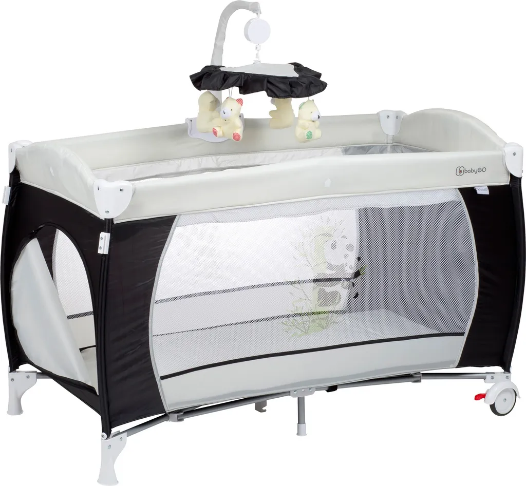 Mit dem babyGO Spiel- und Reisebett Sleeper Deluxe bieten Sie Ihrem Kind einen komfortablen und schönen Ort zum Spielen und Schlafen zuhause oder unterwegs. Je nach Alter und Bedarf des Kindes lassen sich die Matratzen auf der unteren oder oberen Ebene anbringen: Die obere Ebene eignet sich gut als Ort zum Wickeln der Kleinsten, während die untere Ebene schön zum Sitzen, Spielen und Schlafen für etwas größere Kinder ist. Das bunte Musikmobile sorgt für fröhliche Unterhaltung. Beide Matratzen sind im Lieferumfang enthalten. Die Räder auf der Unterseite des Bettes sorgen dafür, dass sich das Spiel- und Reisebett Sleeper Deluxe leicht im Raum verstellen lässt. Die Feststellbremse sorgt für einen sicheren Stand.