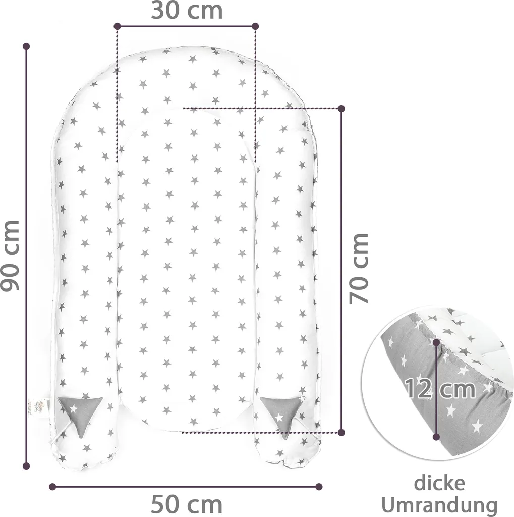 ♥NUR VON TOTSY BABY♥ Babynest ist ständiger Begleiter in vielen Familien. Für alle, deren Kleinkinder sich im Beistellbett zu einsam fühlen die perfekte Wahl. Vorteile: ✔ Schutz vor Zugluft und vor den Reizen in ihrer Umgebung ✔ Geborgenheit – Kokon simuliert die Nähe und Wärme der Mutter. Nestchen ist kuschelig und bietet den unruhigen kleinen Schläfern Begrenzung, wie in Mamas Bauch. ✔ Familienbett tauglich – man kann Cocoon mit ins Bett nehmen. ✔ Materialen sind luftdurchlässig. ✔ Kuschelnest wächst mit Ihrem Baby Kind mit! Dank den eingenähten Schnürchen lässt es sich in Länge und Breite einstellen. Schlaffläche ist 70cm lang – man kann Schnürchen lockern und damit mehr Platz gewinnen – bis zu 90cm. ✔ Einsatzmöglichkeiten sind vielfältig – zu Hause, auf Reise und bei Besuch. Produktdetails Bezug: Baumwolle Füllung: Polyester Gewicht: ca. 1,1kg. Bis 30 Grad waschen, höhere Temperaturen können zu Verfärbungen führen. Praktische Baumwollschnürchen zum Zusammenziehen oder Lockern des Kokons. Dicke der Umrandung ca. 12 cm. Abmessungen außen: 90x50cm; Schlaffläche: 30x70cm. Doppelseitig verwendbar unisex für Mädchen und Jungs, +/- 5 cm Abweichungen sind möglich. HINWEIS: Babynestchen ist für Neugeborene und Frühgeborene bis 9 Monate. Sicherheitswarnung: Verwenden Sie das Nestchen immer auf einer ebenen Fläche. Bitte legen Sie den Kopf des Babys immer an die Spitze und die Füße zur zugeschnürten Nestchenöffnung. Das Baby nie unbeaufsichtigt im Babynest liegen lassen. ACHTUNG! Der Farbton kann leicht variieren, abhängig vom Licht auf den Fotos (natürlich / künstlich), der Materialcharge oder den Monitor Einstellungen.