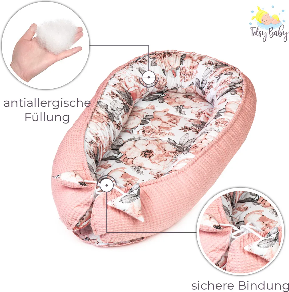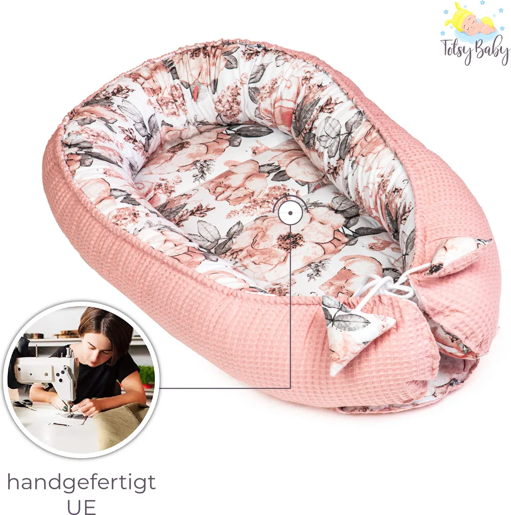 ♥♥♥NUR VON TOTSY BABY♥♥♥ Babynest ist ständiger Begleiter in vielen Familien.✔ Schutz vor Zugluft und vor den Reizen in ihrer Umgebung. ✔ Geborgenheit – Kokon simuliert die Nähe und Wärme der Mutter. ✔ Leicht, handlich, einfach verstaubar. ✔ Materialen sind luftdurchlässig. ✔ Kuschelnest wächst mit Ihrem Baby mit! Dank den eingenähten Schnürchen lässt es sich in Länge und Breite einstellen. Kokon ist 70cm lang – mann kann Schnürchen lockern und damit mehr Platz gewinnen – bis zu 90cm. ✔ Einsatzmöglichkeiten sind vielfältig – zu Hause, auf Reise und bei Besuch. ♥♥♥ Produktdetails: Bezug: Baumwolle; Füllung: Polyester. Bis zu 30 Grad waschbar. Praktische Baumwollschnürchen zum Zusammenziehen oder Lockern des Kokons. Dicke der Umrandung ca.12 cm. Abmessungen außen: 90×50 cm; Liegefläche: 30x70cm; Herausnehmbare Einlage: 30×70 cm. Doppelseitig verwendbar. +/-5 cm Abweichungen sind möglich. HINWEIS: Babynestchen ist für Neugeborene und Frühgeborene bis zu 9 Monaten. Sicherheitswarnung: Verwenden Sie das Nestchen immer auf einer ebenen Fläche. Bitte legen Sie den Kopf des Babys immer an die Spitze und die Füße zur zugeschnürten Nestchenöffnung. Das Baby nie unbeaufsichtigt im Babynest liegen lassen. ACHTUNG! Der Farbton kann leicht variieren, abhängig vom Licht auf den Fotos (natürlich / künstlich), der Materialcharge oder den Monitor Einstellungen.
