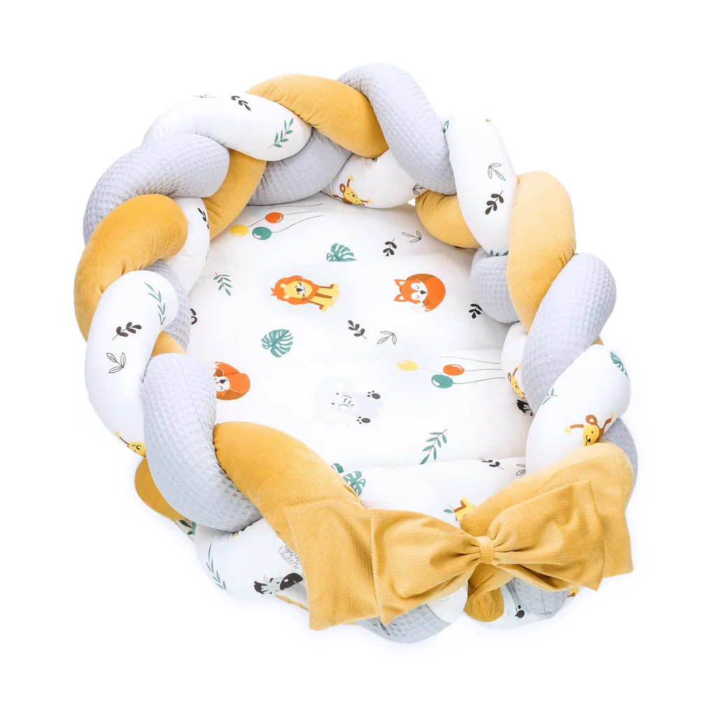 Ein einzigartiges Babynest zum selbstmontieren, bestehend aus Babymatte, Zopf Zierkissen und Schleife – zusammen ein echter Hingucker! Für alle, deren Kleinkinder sich im Beistellbett zu einsam fühlen die perfekte Wahl. Man kann auch beides getrennt voneinander nutzen, z.B. nur die Matte alleine als weiche Unterlage auf einem Teppich und den Zopf als Dekokissen. Aus Materialien höchster Qualität, mit STANDARD 100, die für zarte Babyhaut angemessen sind. Baumwolle (IW 00180), Velvet – (Polyester): (20.HCN.16515), Minky – (Polyester): (11.HCN.96881)♥♥♥