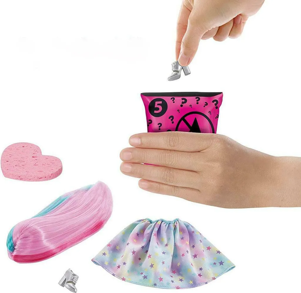 Die Mystery Bags enthalten verschiedene Accessoires: Ohrringe, einen Glitzerrock, glitzernde Schuhe und einen langen ansteckbaren Pferdeschwanz. Mit diesen Verzierungen kannst du deine eigene einzigartige Puppe gestalten.