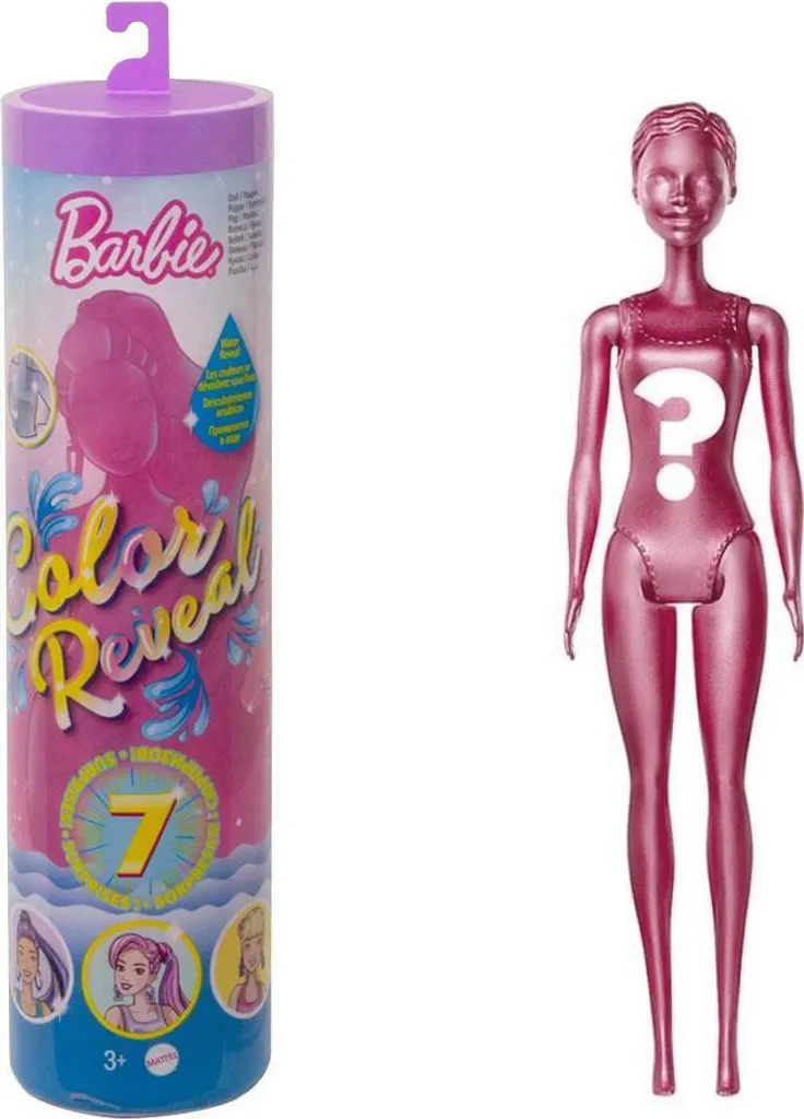 Scarta la confezione di Barbie® Color Reveal per rivelare un’esperienza ricca di sorprese: ben sette! Troverai sempre una bambola con un capo scintillante, ma la vera sorpresa è il look di ogni confezione: aprirla fa parte del divertimento! Tira la striscia per rimuovere lo strato esterno e rivelare un tubo trasparente. All´interno c´è una misteriosa bambola metallizzata Color Reveal e quattro sacchetti che al loro interno nascondono delle sorprese. Svuota il tubo, riempilo con acqua calda, inserisci la bambola e falla girare; l´acqua diventerà rosa metallizzato e, quando tirerai fuori la bambola, scoprirai le sue caratteristiche uniche. Ogni bambola ha una diversa combinazione di colore degli occhi, colore dei capelli metallizzati scolpiti, tonalità della pelle, body decorato e gambe metallizzate scintillanti, ma le sorprese continuano: apri i sacchetti per scoprire un’acconciatura per capelli a coda di cavallo, gonna brillante e scarpe e orecchini a completo. Gli effetti cambia colore sulle labbra della bambola e sul body decorato aggiungono sorpresa e divertimento. Ogni serie ha un tema unico:queste bambole Color Reveal sono scintillanti e luminose, con capelli scolpiti, gambe metallizzate e colorate acconciature da collegare ai capelli. Usa il tubo per riporre questi e altri accessori. Quale bambola troverai? Collezionale tutte per scambiare e abbinare gli accessori ampliando le possibilità di gioco. Età consigliata: 3 anni +