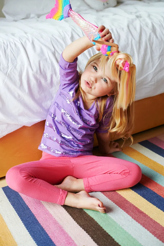 Der farbenfrohe Look von Barbie steht der Meerjungfrau wirklich ausgezeichnet, denn die Schwanzflosse in Regenbogenfarben ist perfekt auf den modellierten Perlengürtel, die pinkfarbenen Strähnchen im Haar und das Prinzessinnendiadem in Barbies Haar abgestimmt!