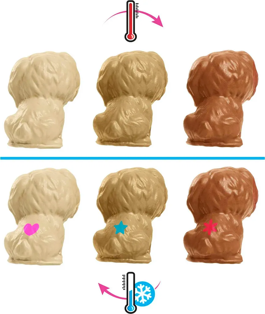 Überraschung! Barbies bezaubernde Hündin ist schwanger! Mit dem neuen Barbie Welpen-Spielset können Kinder der Barbie-Puppe dabei helfen, drei zauberhafte Welpen auf die Welt zu bringen, indem sie auf den Rücken der Hündin drücken. Nachdem die Kinder die Welpen begrüßt haben, können sie die Wanne mit eiskaltem Wasser füllen, dann das Handtuch eintauchen und damit über die Welpen wischen, um ein besonderes Geburtsmal sichtbar zu machen. Dank ihrer beweglichen Kniegelenke ist es für die Barbie-Puppe ein Kinderspiel, die Welpen willkommen zu heißen. In dem zauberhaften Tragetuch kann sie sich unterwegs um alle drei Welpen gleichzeitig kümmern! Außerdem gibt es weitere Zubehörteile wie eine Flasche, zwei Seile, zwei Leckerlis, einen Sack Hundefutter und einen Napf. Mit so viel Zubehör und Spielmöglichkeiten ist dieses Barbie Welpen-Spielset ein tolles Geschenk für Kinder von 3 bis 7 Jahren, besonders für Tierfreunde! Die Puppe kann nicht von allein stehen. Abweichungen in Farbe und Gestaltung vorbehalten.