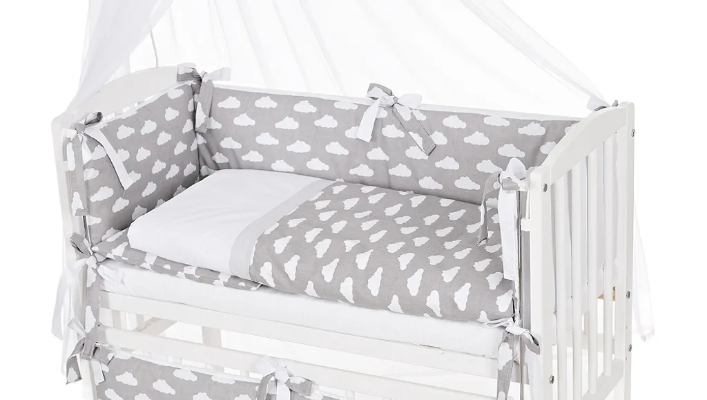 Lieferumfang: Beistellbett (Weiß), Lattenrost, 6-teilige Bettwäsche-Set, Bremsrollensatz, Himmelstange, Matratze.