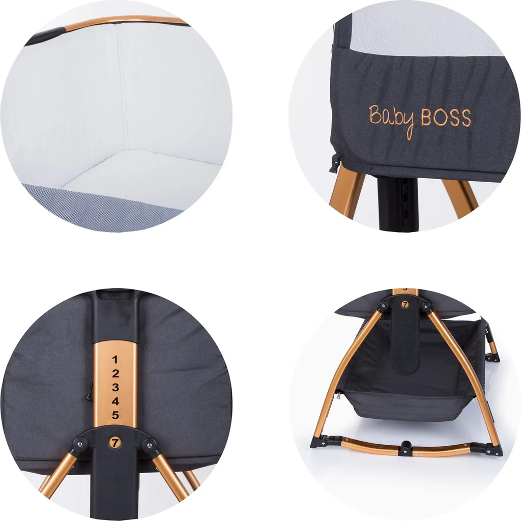 Das praktische Beistellbett Baby Boss mit Rollen von Chipolino ist für Kinder an Geburt geeignet. Es ist siebenfach in der Höhe verstellbar, wodurch es direkt an das Elternbett gestellt werden kann. Das Bett verfügt über eine Anti-Reflux-Position und einer Seite zum Öffnen. Zudem enthält es eine mit manuelle Schaukelfunktion, Ihr Baby schläft im eigenen Bettchen und gibt Ihnen ein sicheres Gefühl jederzeit direkt auf Ihr Baby zugreifen zu können. Im Lieferumfang enthalten ist eine weiche Matratze und ein Moskitonetz. Die Ablagefläche unter dem Bett bietet ausreichend Platz für Ersatzklamotten oder Wickelzubehör. Wird das Bett nicht , kann es schnell und kompakt zusammengeklappt und verstaut werden.