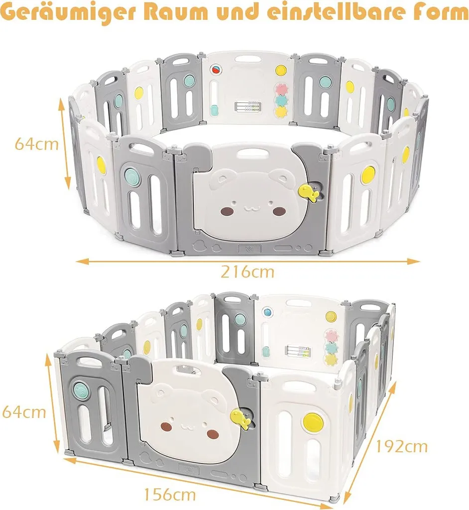 Hergestellt aus sicheren und langlebigen HDPE-Materialien ist unser Laufgitter nicht nur überaus robust, sondern ebenso unbedenklich für Ihr Baby. Die rutschfesten Gummipads auf der Unterseite verhindern hierbei ein Verrutschen und Umkippen des Laufgitters.Der Kinderlauf ist dabei überaus kindgerecht und farbenfroh konzipiert und lädt mit seinen Spielzeugen zum Erkunden und Lernen ein. Sie können es außerdem bequem an jedem Ort aufbauen und verwenden, wo Sie es gerade benötigen, um genug Zeit für die Hausarbeit zu haben oder sich endlich eine wohlverdiente Pause gönnen.