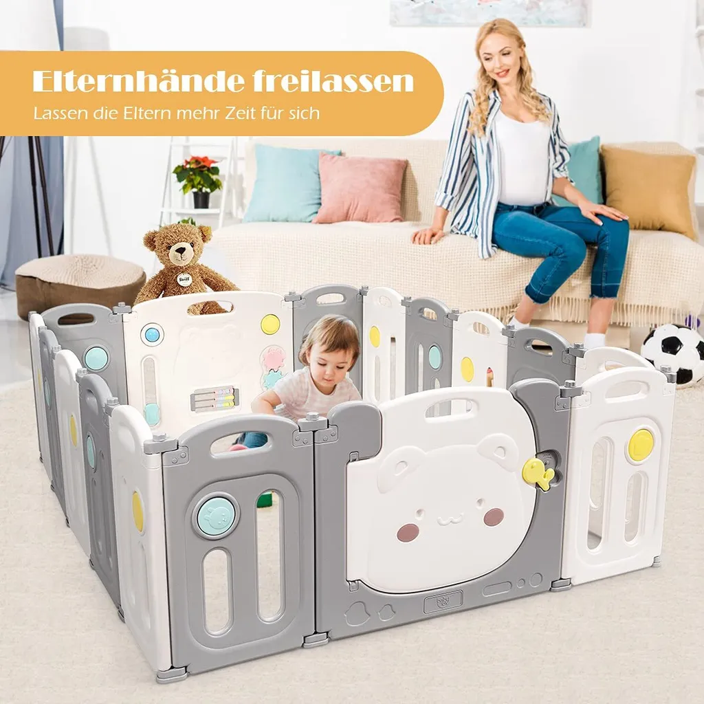 Die 12/14/16 Paneelen ermöglichen Ihrem Baby eine großzügige Fläche zum Spielen, Klettern und Lernen. Hierbei kann es versuchen sich in den Stand zu ziehen und dabei die ersten Schritte lernen. Darüber hinaus befindet sich auf der Innenseite der Türverkleidung eine kleine Aufbewahrungstasche, um Ihrem Kind erste Möglichkeiten zum Verstauen von Spielzeug zu ermöglichen, ganz wie die Großen es tagtäglich tun.