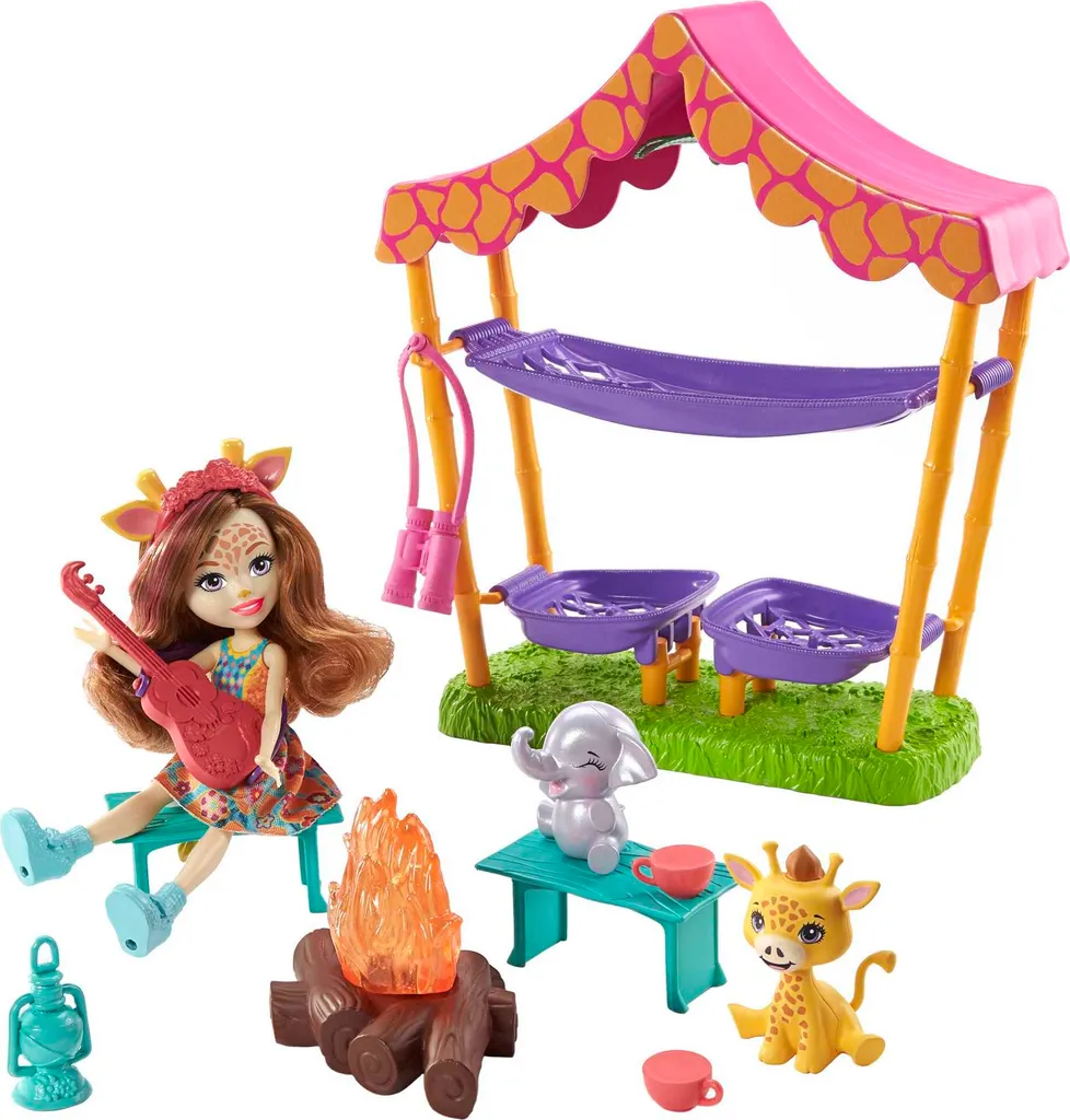 Mit Griselda Giraffe und ihren besten Tierfreunden auf Erkundungstour in der Sonnensavanne. Dieses Enchantimals Pyjamaparty-Spielset steckt voller Spielspaß. Wenn sich die Enchantimals am Lagerfeuer auf den Bänken zusammenfinden, entstehen mit lustigen Accessoires wie einer Gitarre, Tassen, Laternen und mehr ganz besondere gemeinsame Momente. Und später erwarten sie süße Savannenträume unter dem Zeltdach. Für Griselda Giraffe gibt es eine Hängematte unter einem blattartigen Deckenventilator, der sich dreht, und für Giraffe Antenna und Elefant Stompah sind 2 Bettchen vorbereitet. Die besondere Verbindung dieser Enchantimals-Freunde lässt Kinderherzen höher schlagen! Abweichungen in Farbe und Gestaltung vorbehalten.