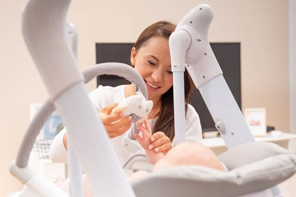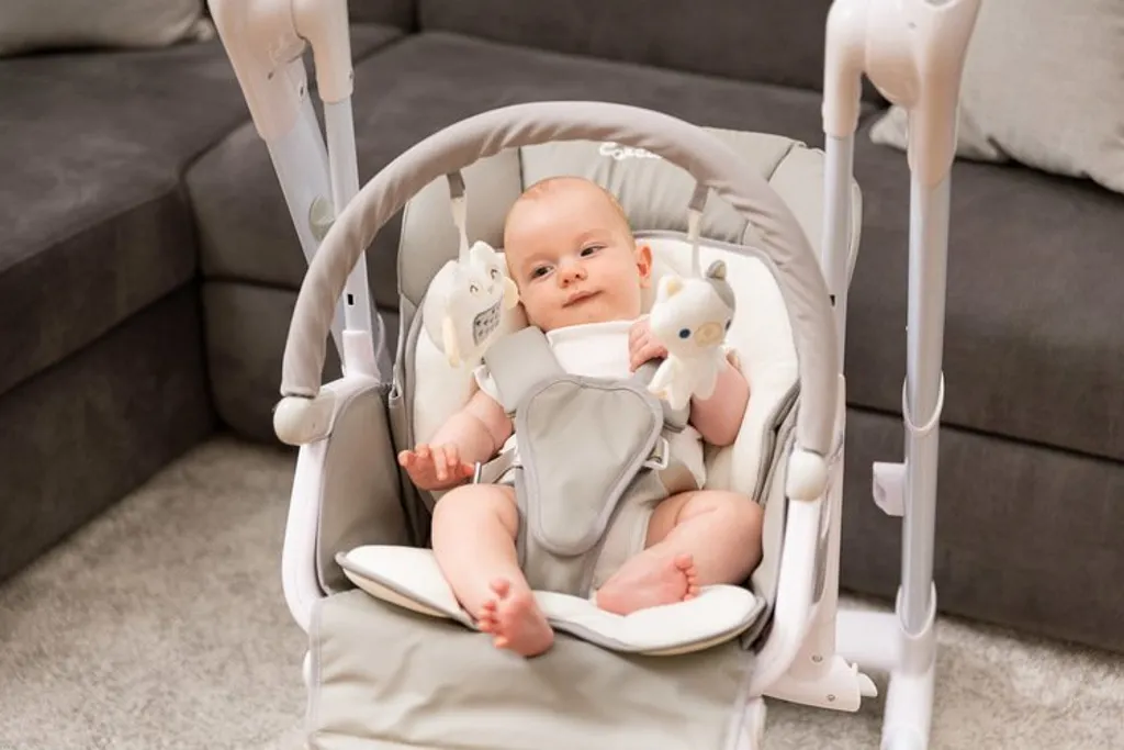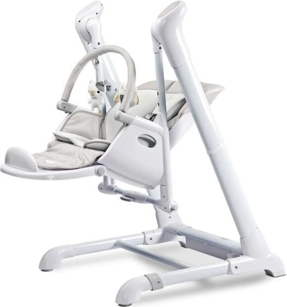 2in1 Hochstuhl und elektrische Babyschaukel Grau mit Melodien, Geräuschen und Plüschtieren