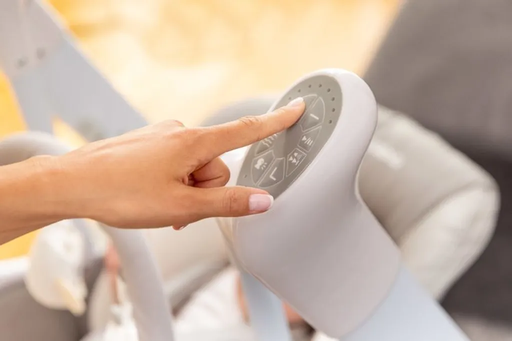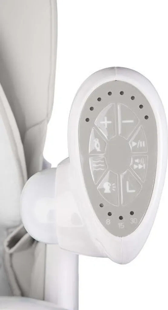 Die große und 4-stufig verstellbare Lehne und die elegante und weiche Polsterung sorgen für angenehmen Komfort. Diese Polsterung ist abnehmbar und leicht zu reinigen. Mit dem Timer kann die Schaukel automatisch nach 8, 15 oder 30 Minuten abgeschaltet werden.