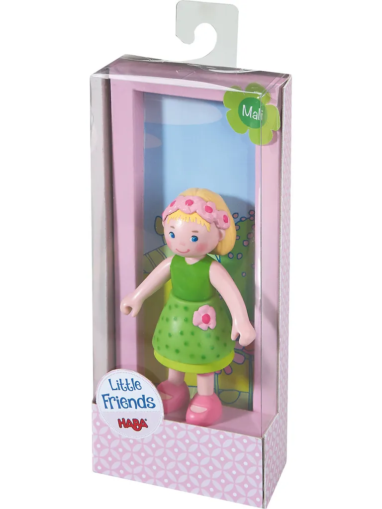 Tauche in die neue Welt der Little Friends von Haba ein. Mit der Biegefunktion lassen sich die bunt verzierten Puppen ganz einfach formen und können jede Position passend der Situation annehmen.Mali ist die süßeste und niedlichste unter den Freunden. Sie verbringt gerne sehr viel Zeit mit ihren Freunden und sie ist so liebenswert, dass jeder sie gerne um sich hat.Mali trägt ein Sommerkleid mit verschiedenen Grüntönen und verziert es mit einer wunderschönen Blume. Zudem träg sie ein Blumenhaarband.+++Details++++ 1 Puppe+ Material: Kunststoff und Metall+ Maße: 10 cm