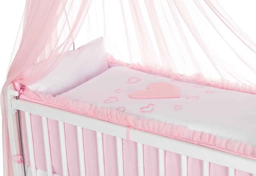 Lieferumfang: Beistellbett, Lattenrost, Matratze, 6-teiliges Bettwäsche-Set, Himmelstange, Bremsrollensatz.