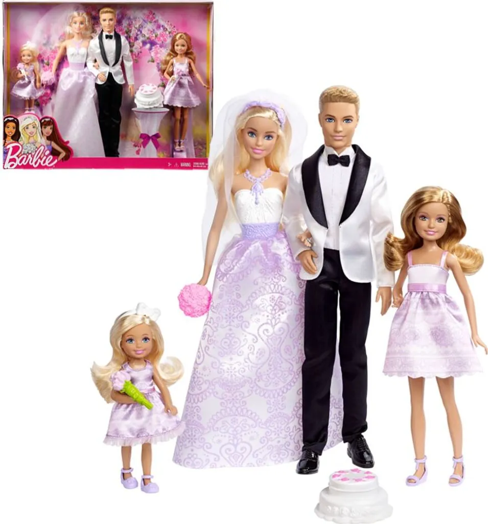 Barbie als wunderschöne Braut, ihren Bräutigam Ken und ihre Schwestern Stacie und Chelsea als Brautjungfern.
