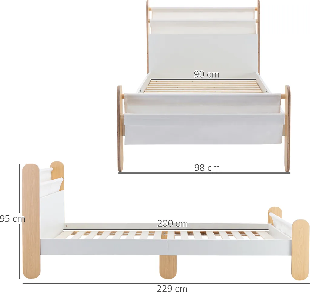 Mit dem Kinderbett von HOMCOM bringen Sie Funktionalität und Schönheit in Ihr Kinderzimmer! Die Farbkombination aus schlichtem Weiß und natürlichem Holz verleiht dem Bett ein zeitloses und elegantes Aussehen, das zu allen Einrichtungsstilen passt. Zwei Taschen am Kopfende und Fußende des Bettes bieten zusätzlichen Stauraum für unterschiedlichste Gegenstände. Ein ideales Geburtstagsgeschenk für Ihr Kind: Zögern Sie nicht, es zu kaufen!
