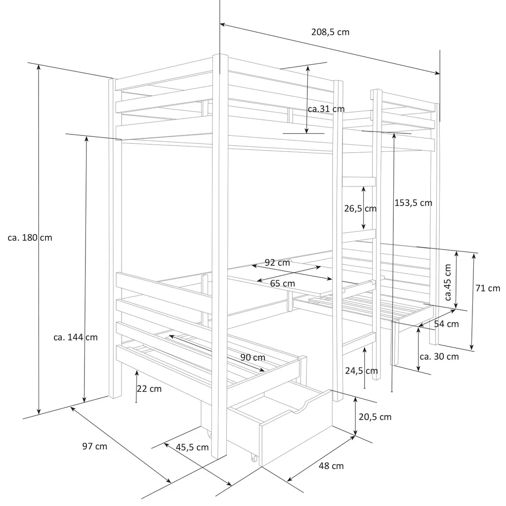 - Bett Außenmaß (B x T x H): 97 x 208 x 180cm