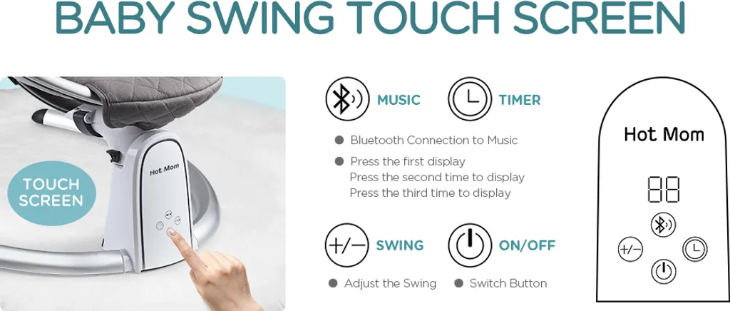 ✔【SWING & TIMING】: Die Hot Mom Babywippe ist mit einer verbesserten Schaukel- und Timing-Funktion ausgestattet. Über den LED-Touchscreen kann die Schaukelbewegung in einem 5-Gang-Schwenkbereich gesteuert werden. Die intelligente 3-Gang-Timing-Einstellung ermöglicht es, die Schaukelbewegung an die Bedürfnisse des Babys anzupassen. So kann die Hot Mom Babywippe das Baby beruhigen und ihm ein Gefühl von Sicherheit und Komfort geben.➤➤➤