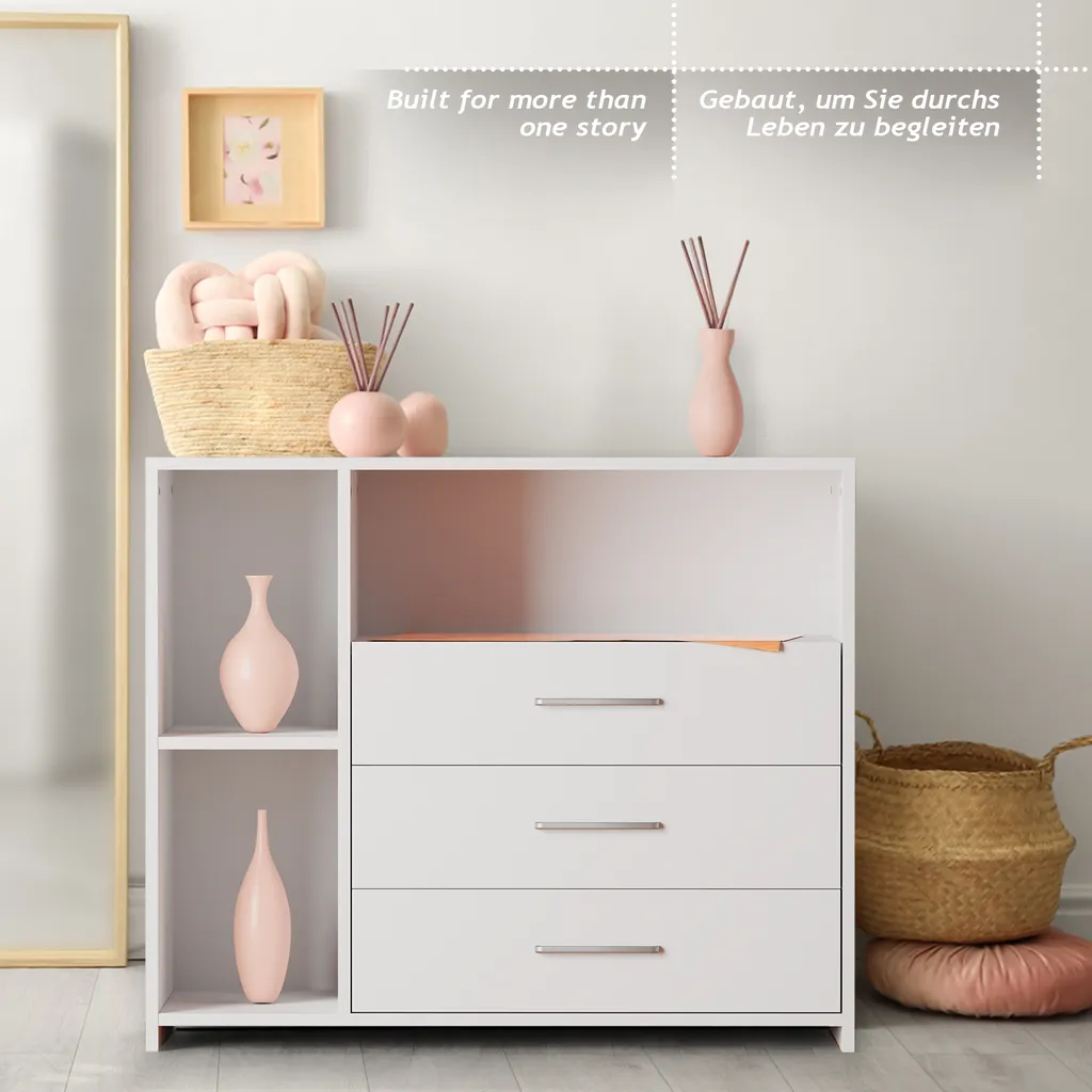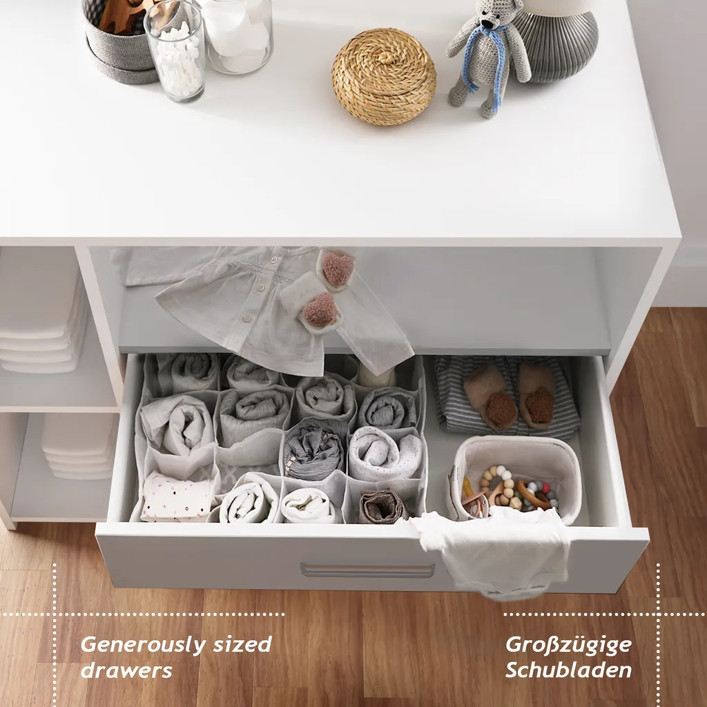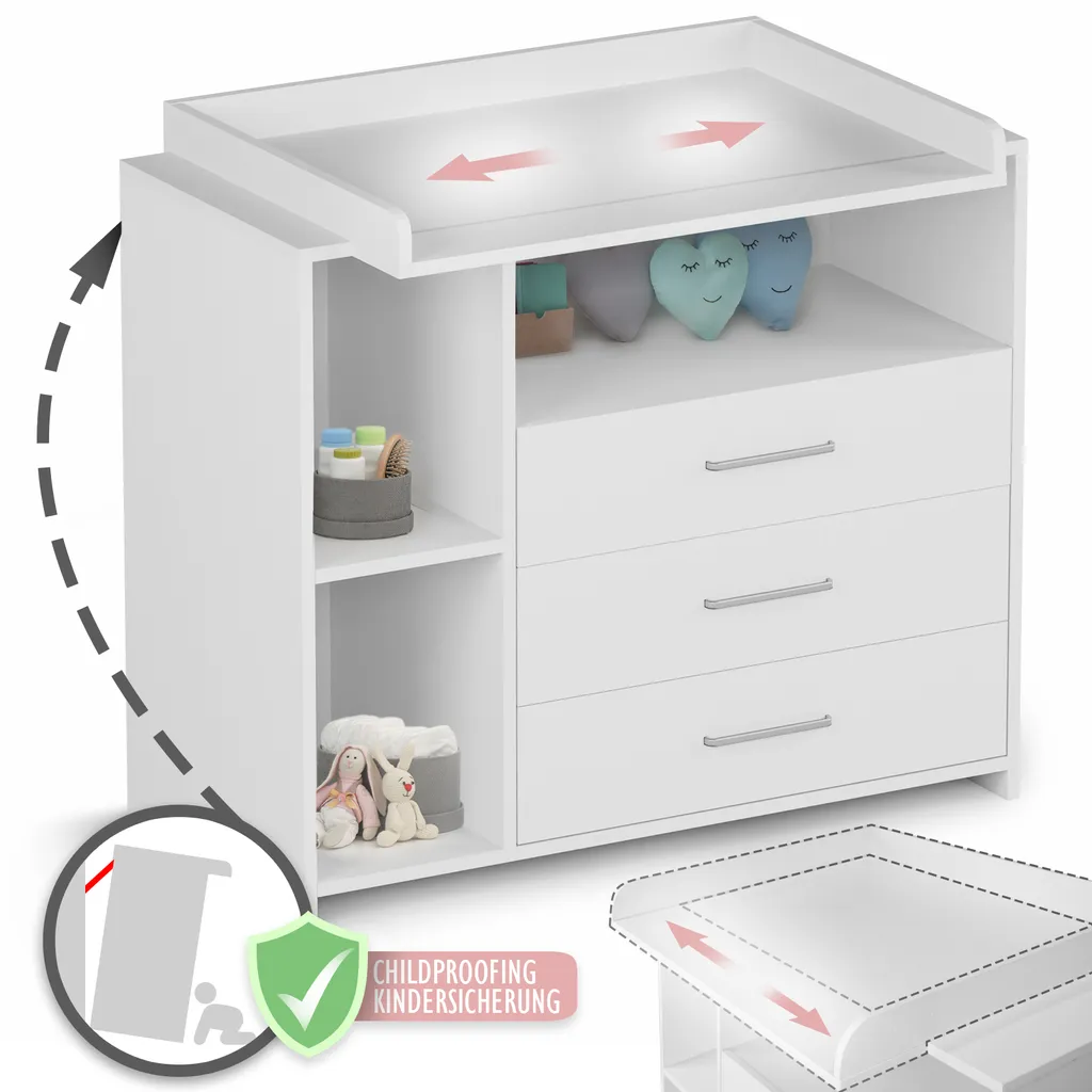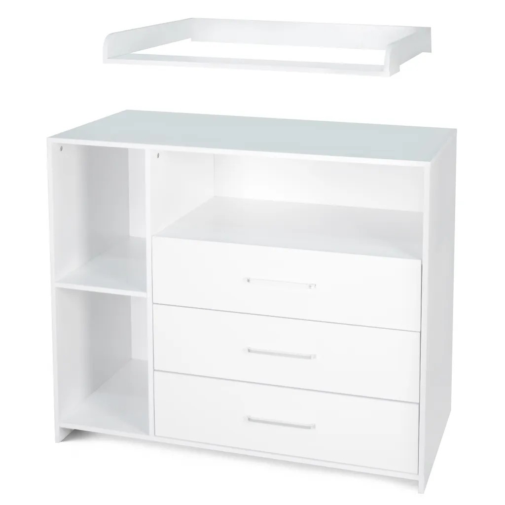 Elegantes Design und viel Platz sind die Hauptmerkmale dieser Wickelkommode. Mit viel Stauraum in drei Schubladen und drei offenen Ablageflächen ist unsere Wickelkommode die ideale Ergänzung für das Kinderzimmer. Windeln auf einer großen Wickelfläche zu wechseln und Windeln, Kleidung, Babypflegeprodukte und vieles mehr in greifbarer Nähe zu haben, wird Ihnen und Ihrem Baby ein angenehmes Gefühl geben. Die weiße Farbe dieses Babymöbelstücks passt leicht in eine Reihe von Einrichtungsstilen. Ist Ihr Kind dem Wickelalter entwachsen, können Sie die Wickelauflage dieses multifunktionalen Möbelstücks einfach dauerhaft entfernen. Die Kommode kann so weiter genutzt werden und wächst mit dem Entwicklungsstand Ihres Lieblings mit.