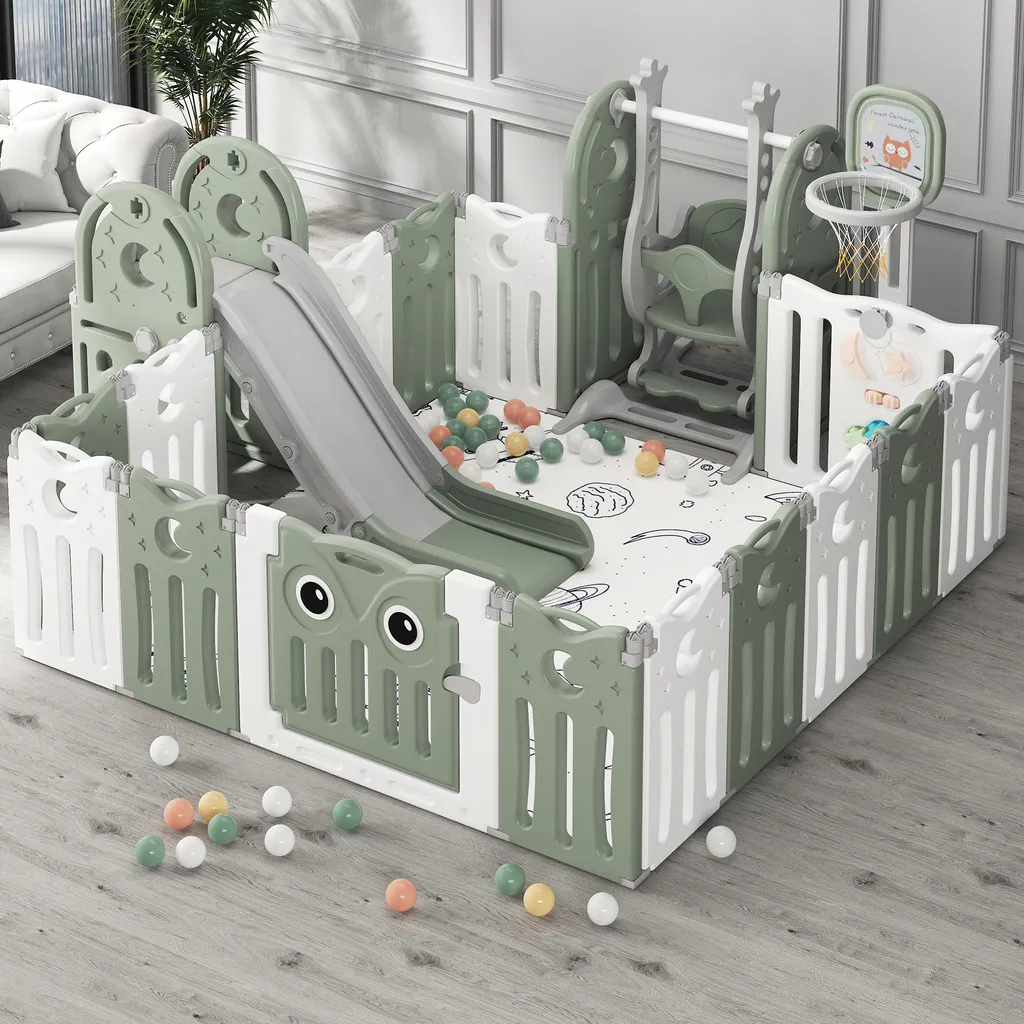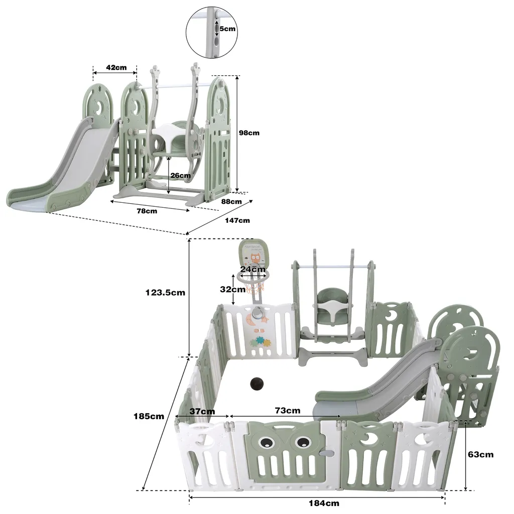 Das interessante Aktivitätszentrum verfügt über einen Laufstall, eine Rutsche, eine Schaukel, einen Basketballkorb, einen Ball und einen BB-Sound-Knopf, der die Neugier und Fantasie Ihres Babys wecken kann. Frei, Produkte nach Bedarf zu zerlegen und einzurichten.