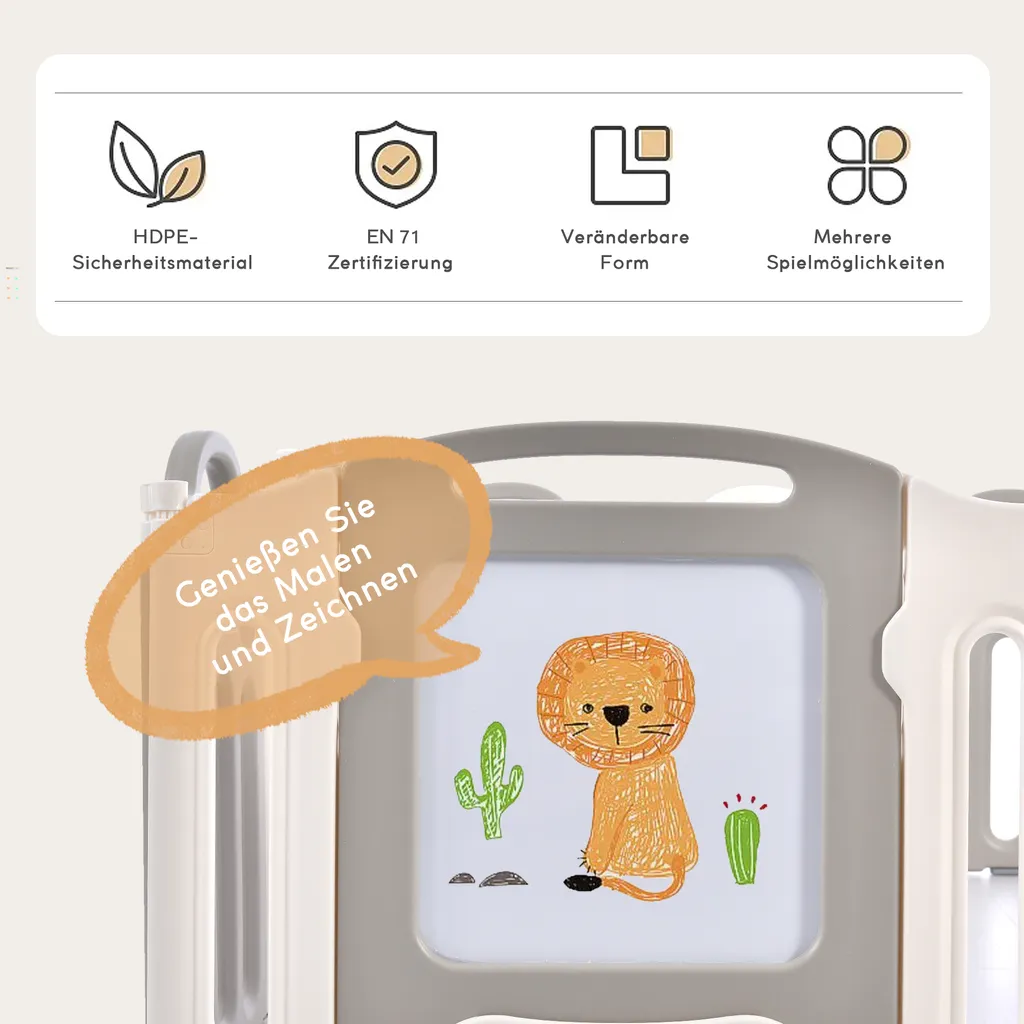Sicherer Schutz für Kinder: Das Laufgitter ist aus umweltfreundlichem HDPE-Material hergestellt und geruchsneutral. Die Kanten des Laufstalls sind sorgfältig poliert, damit sie sich glatt anfühlen und leicht zu reinigen sind. Das gesamte Produkt hat die der Serie EN71 bestanden.
