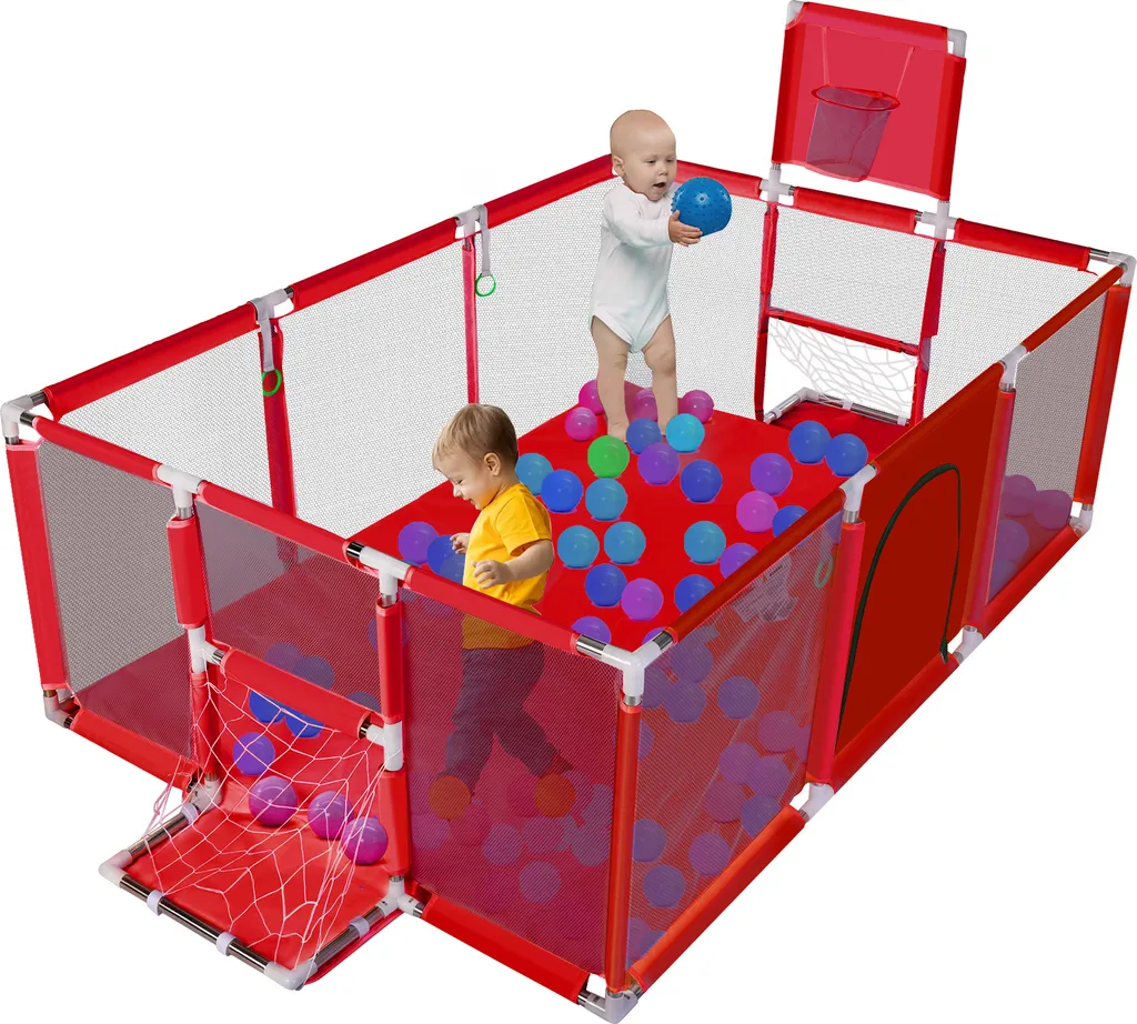 “ Fitness-Koordinierung“: Der Spielzaun ist mit einem Basketball und zwei Fußballtoren ausgestattet, die es dem Baby ermöglichen, das Werfen und Spielen zu üben. Förderung der Flexibilität und Koordinierung von Babys und der Wahrnehmung der Welt durch das Baby.