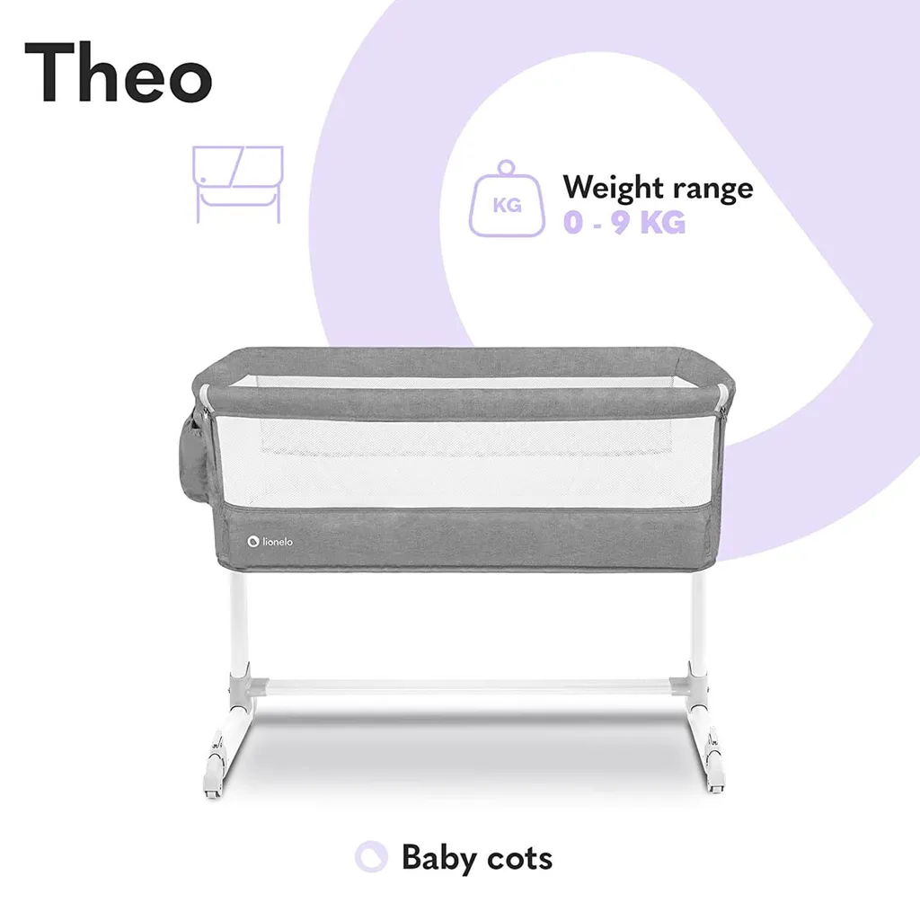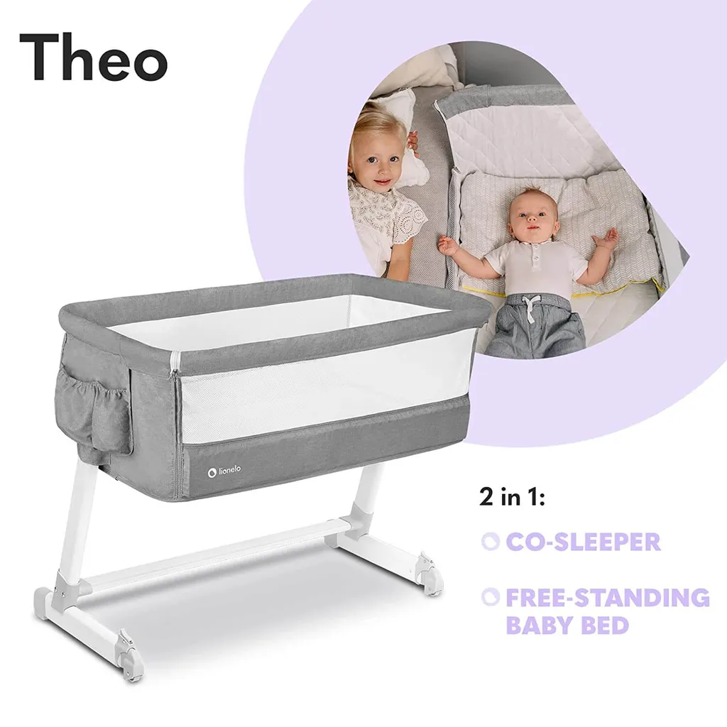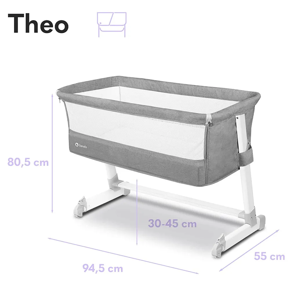 Lionelo Beistell- Babybett Theo in grau mit Matratze, Moskitonetz, Organizer und Tasche