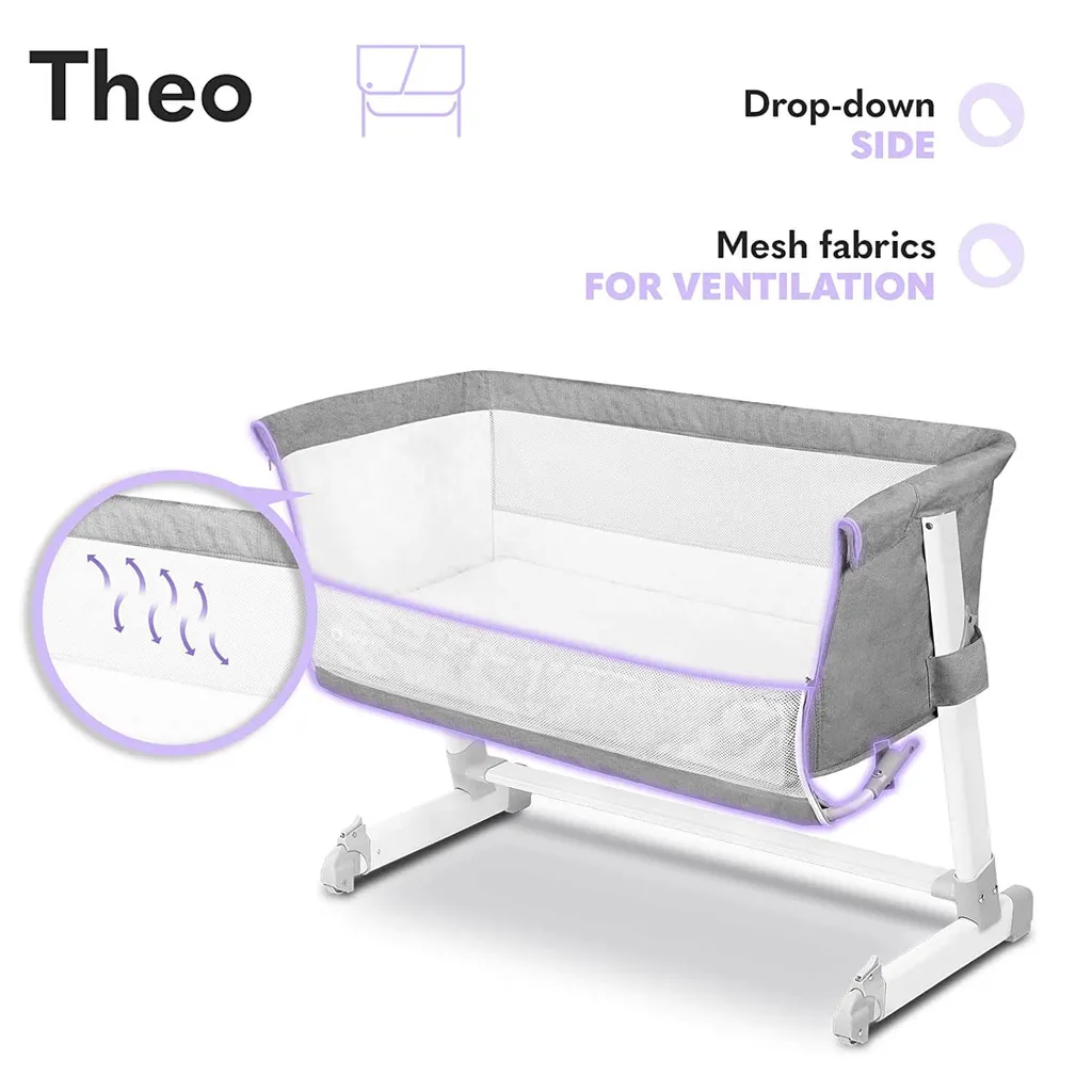 Das Kinderbett Theo kann auf bis zu 5 verschiedene Höhen eingestellt werden und kann sich dadurch an jedes Bett anpassen. Die Füße sowie die Neigung des Bettes können ebenfalls verstellt werden. Die Seite kann durch Reisverschlüsse geöffnet werden und ermöglicht so den direkten Kontakt zwischen Eltern und Kind.