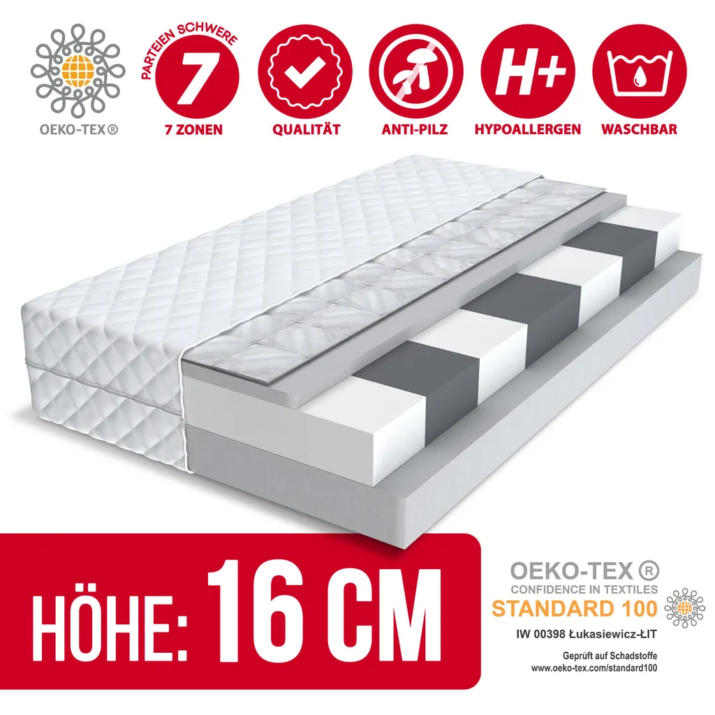 hergestellt aus antiallergischen Materialien mit Membranstruktur. Der Bezug ist mit einem Reißverschluss versehen, abnehmbar und waschbar. Bietet ein Höchstmaß an Frische und Hygiene.