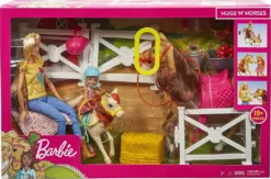 Die Tiere sind mit Äpfeln, Karotten und Heu bestens versorgt. Ein Futtertrog, ein Korb und eine Flasche eröffnen zusätzliche Spielmöglichkeiten. Die Köpfe von Pferd und Pony sind beweglich, sodass sie beim Fressen, Reiten oder Anstupsen echte Bewegungen nachahmen können. Die beiden Puppen tragen lässige Outfits mit Stiefeln und Helmen. Ihre Knie sind beweglich, damit Barbie und ihre Schwester fest im Sattel sitzen.