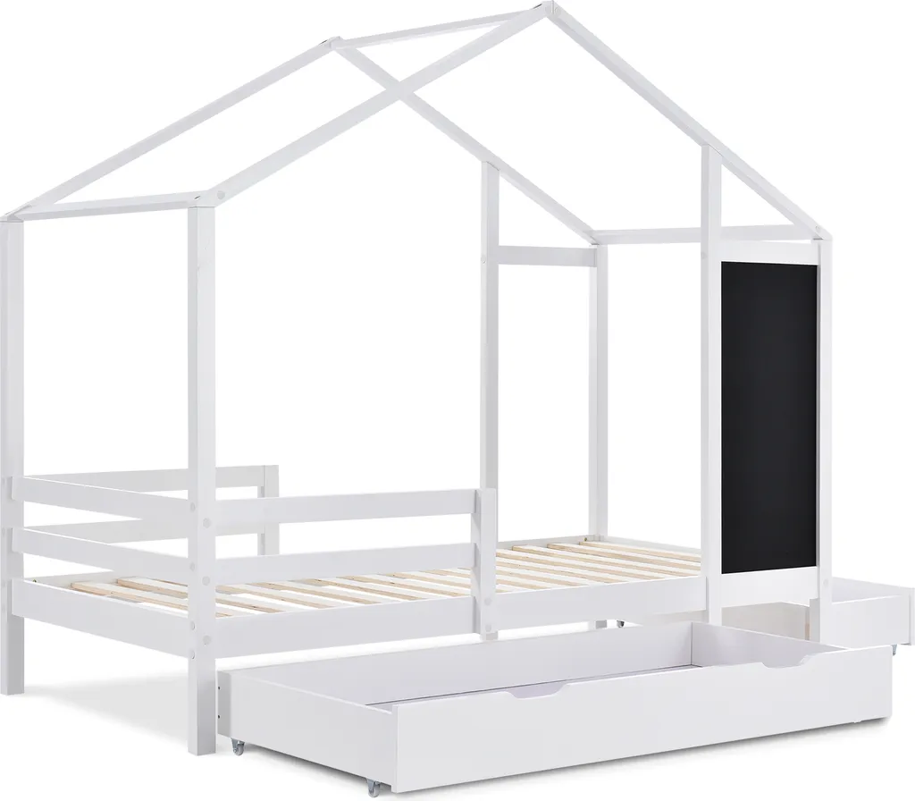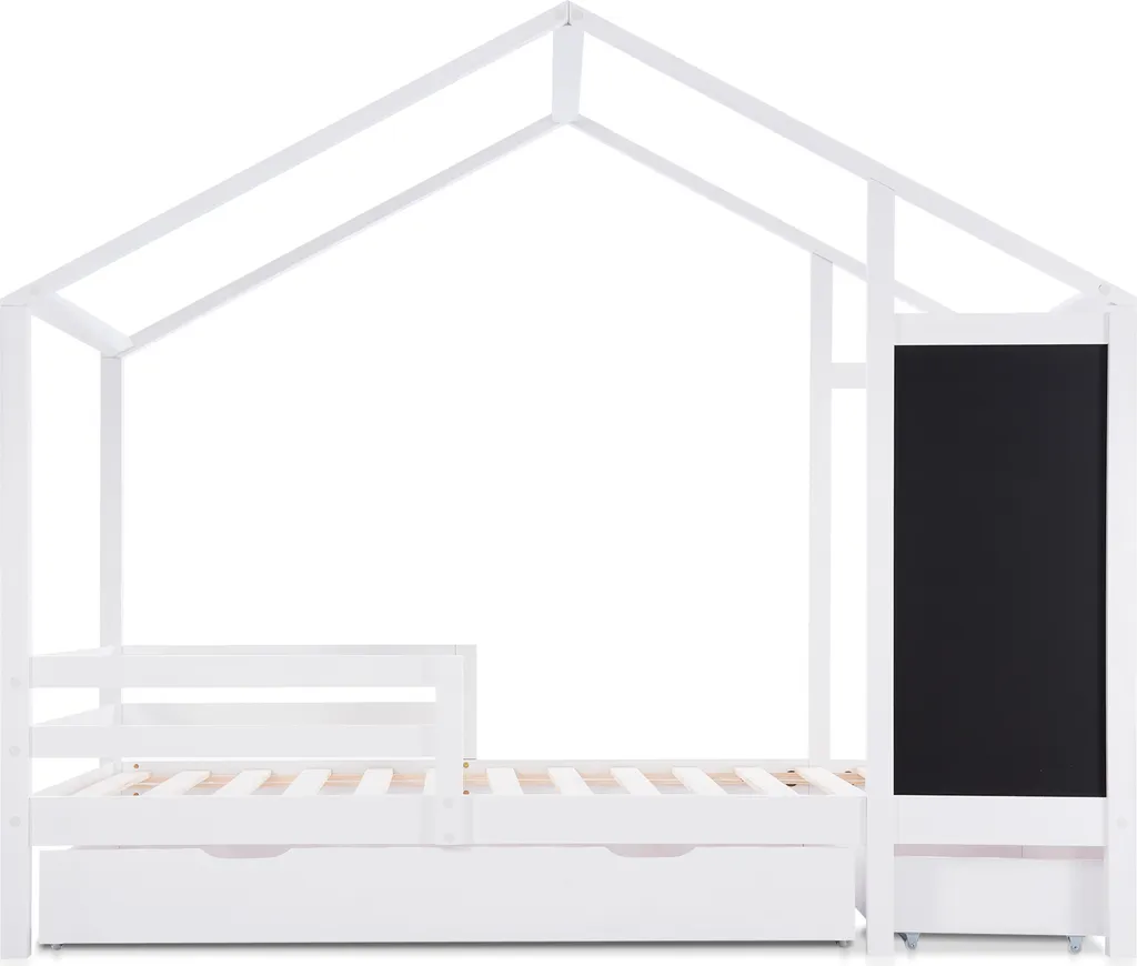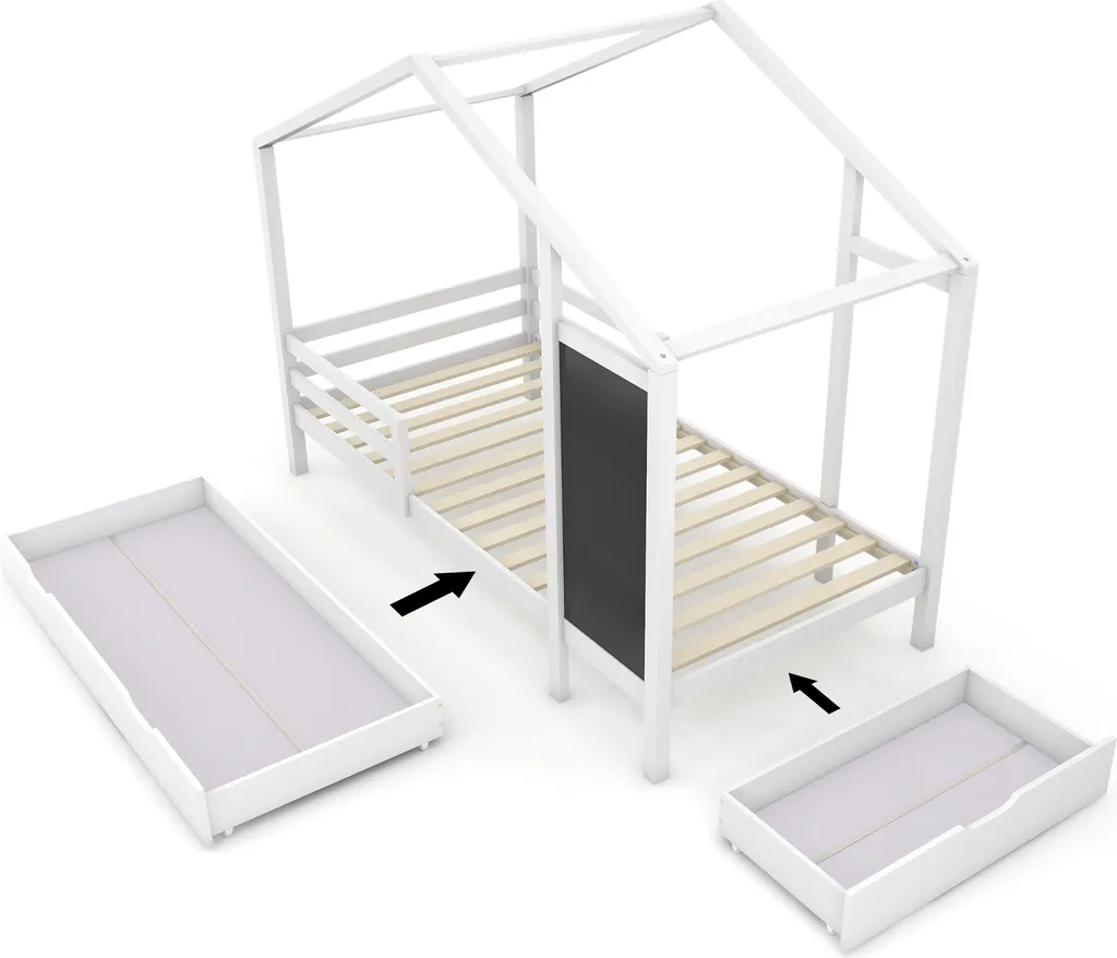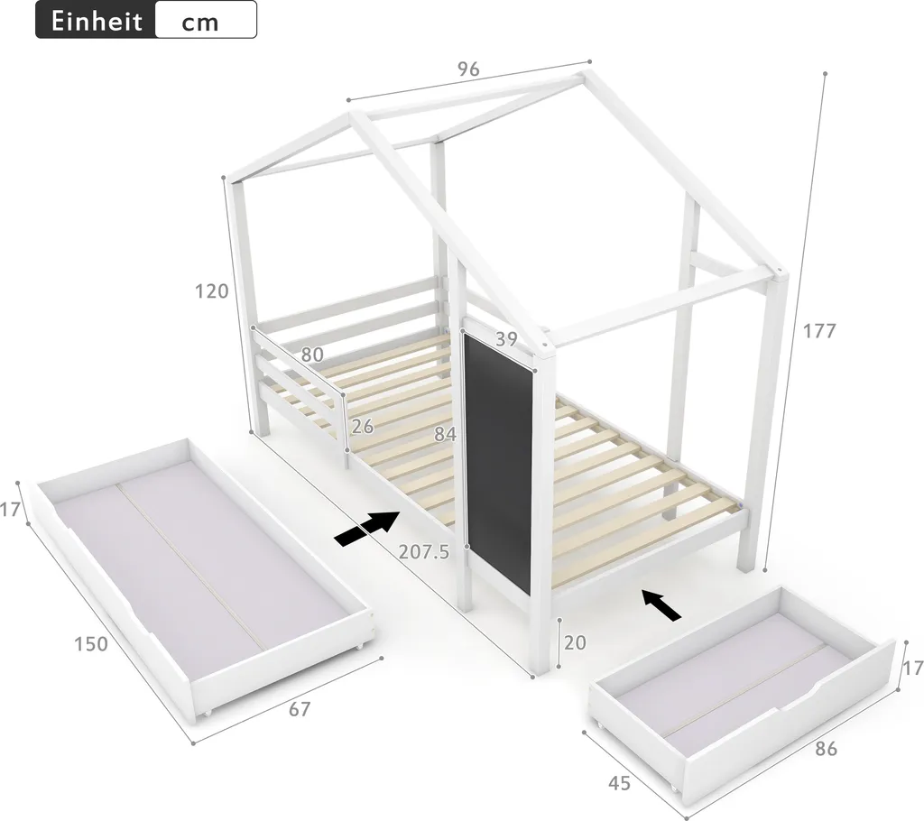 🌱【Vielfältige Lagerungsfunktionen】Die Vorder- und Seite des Bettes sind mit Schubladen mit unterschiedlichem Stauvolumen ausgestattet.Die Größe der großen vorderen Schublade beträgt 150x67x17 cm,in der große Gegenstände wie Decken oder Kinderschlafpuppen aufbewahrt werden können. Die Größe der seitliche Schublade beträgt 86 x 45 x 17 cm und kann einige Zeichenkreide aufbewahren.