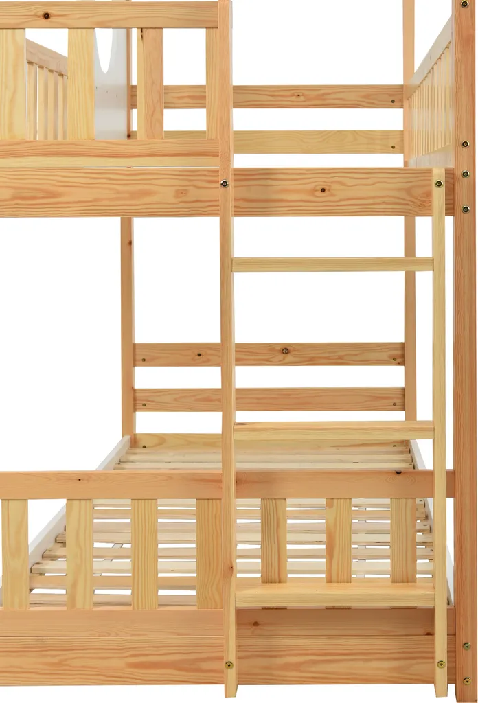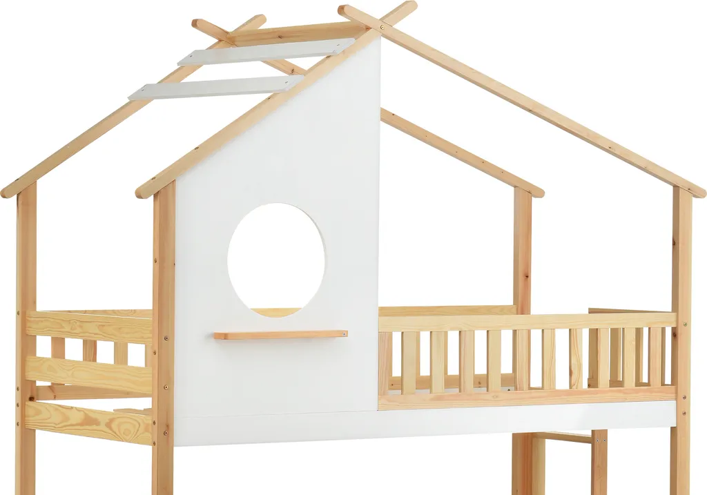 🌱【Einzigartige Farbabstimmung】Der gesamte Rahmen des Bettes ist in klassischer Naturfarbe gehalten, die Balken auf der Bettoberseite, die Fensterpaneele und die Seitenteile des Bettes sind in frischem Weiß gehalten. Die Kombination der beiden Farben ist harmonisch und charaktervoll.