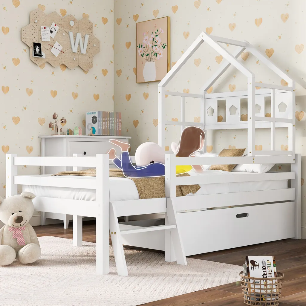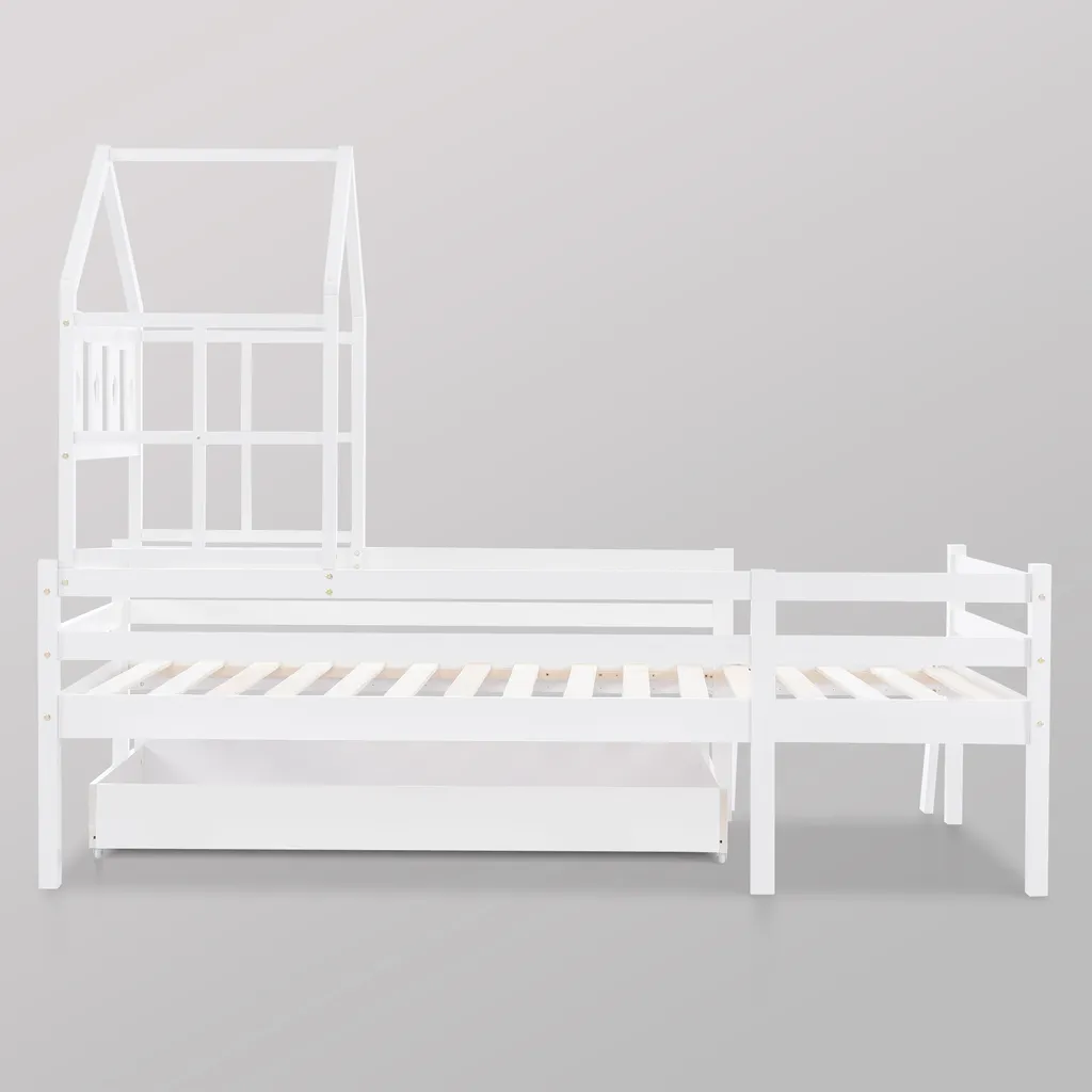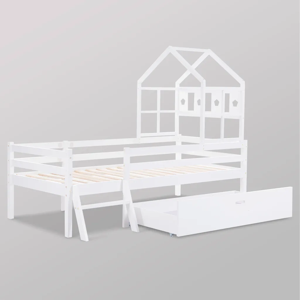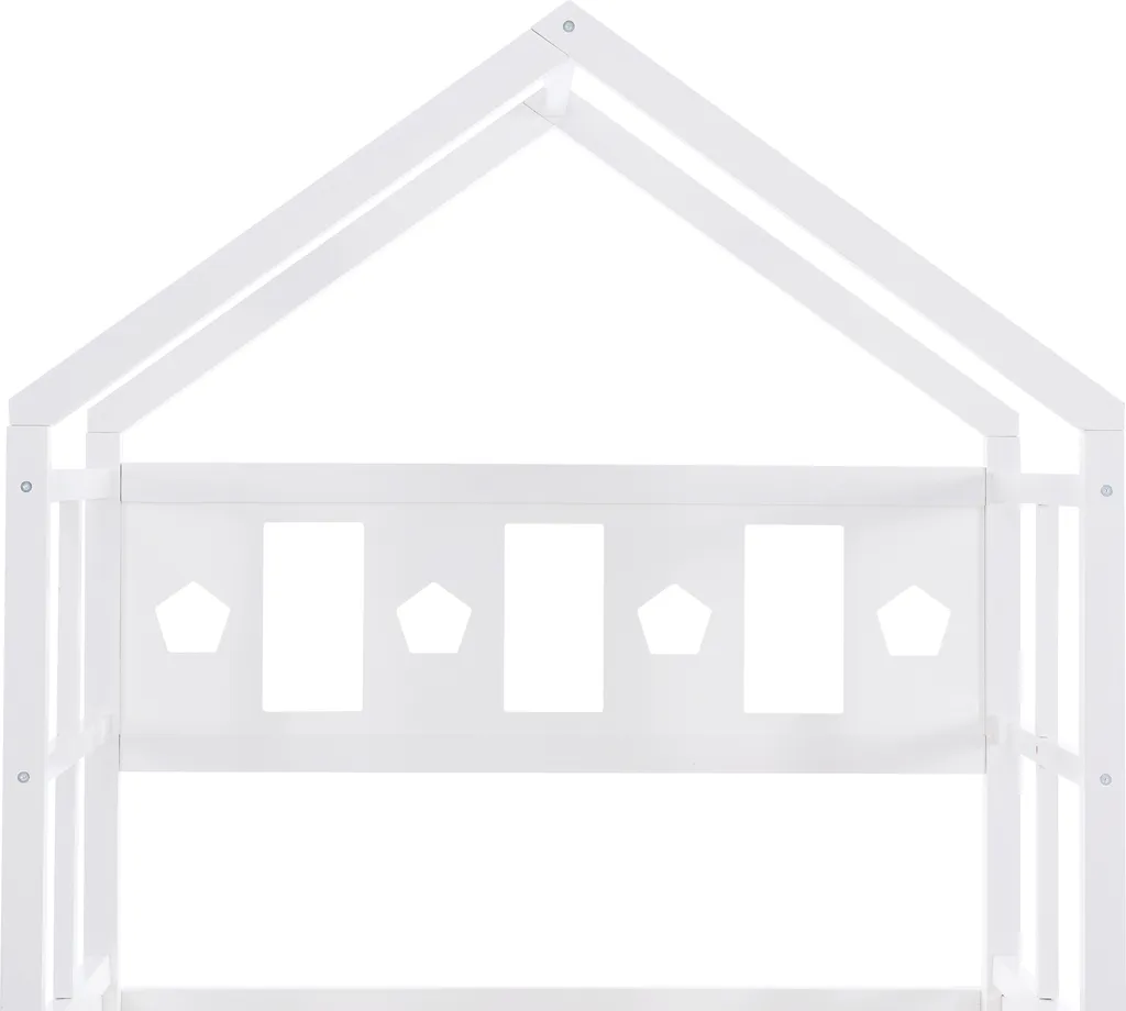 🌱【Schicker Stil Hochbett】Dieses Bett vereint die Vorteile einer Waldhütte und eines Hochbettes mit einer einzigartigen Form, zwei Seiten sind Fenstergitterformen und eine Seite ist hohle geometrische Muster. Der 28 cm hohe Zaun an allen Seiten macht den Schlaf der Kinder nachts sicherer.