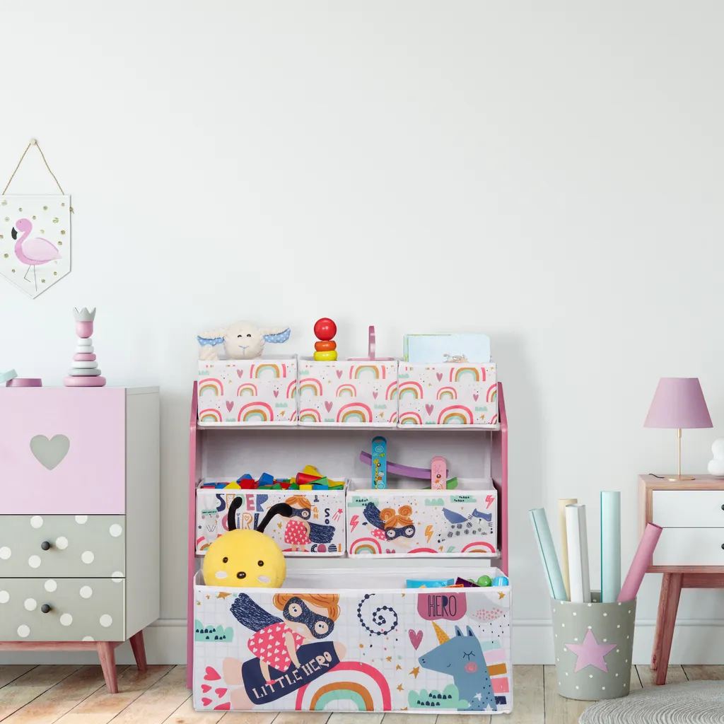 Das Spielregal eignet sich ideal zur Spielzeugaufbewahrung im Kinderzimmer. In 6 Boxen unterschiedlicher Größe steht ausreichend Platz zur Verfügung, um Kuscheltiere, Bücher, Bauklötze und mehr ordentlich zu verstauen. Dank der kindgerechten Höhe können bereits Kleinkinder das stabile Spielsachenregal selbstständig aus- und einräumen. Das coole Superheldin-Motiv wird Mädchen begeistern und macht das Spielzeugaufbewahrungsregal zu einem schönen Blickfang im Kinderzimmer.