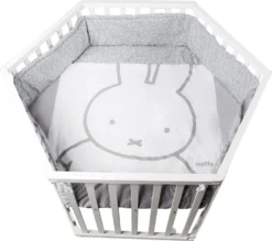 Das 6-eckige roba Laufgitter aus Holz ist weiß lackiert und mit einer kuscheligen Textileinlage im entzückenden ‚miffy®‘-Design sowie mit Flachstäben ausgestattet. Die gepolsterte Stoffeinlage und das Nestchen des 3-fach höhenverstellbaren und somit rückenfreundlichen Laufstalls sorgen für Rundumschutz Ihres kleinen Lieblings. Eine praktische Ergänzung, um das Laufgitter in ein Tagesbett zu verwandeln, ist die separat erhältliche 6-eckige Laufgittermatratze (Art.-Nr. 0307W). So wird der Laufstall im Handumdrehen zu einem gemütlichen Bettchen für Säuglinge, um tagsüber ein Schläfchen zu halten. Die Bremsrollen sorgen bei diesem Baby-Krabbelgitter für einen sicheren Stand wie auch die nötige Mobilität. Das roba Laufgitter wurde nach der aktuellen Norm EN 12227:2010 in Deutschland entwickelt. Der verwendete Lack ist lebensmittelecht und hautverträglich. Das Spielgitter kann zum Reinigen mit einem feuchten Tuch abgewischt werden. Die Schutzeinlage aus 65 % Polyester und 35 % Baumwolle ist mit Polyestervlies gefüllt und maschinenwaschbar und trocknergeeignet. Das 6-eckige roba Markenlaufgitter aus Holz ist bis 15 kg belastbar und hat die Maße: 72 x 121 x 106 cm (H x B x T).