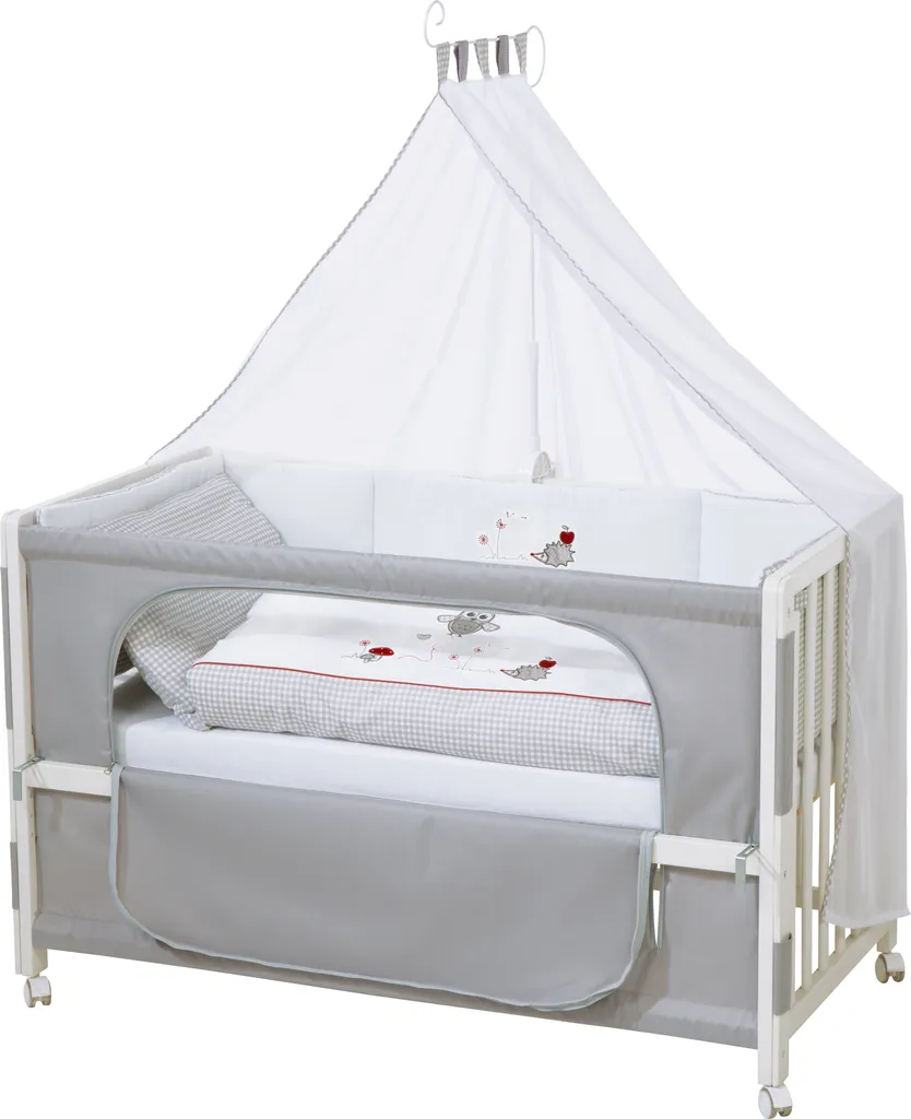 Das Room Bed Adam und Eule kann sowohl als Beistellbett als auch als Kinder- und Juniorbett verwendet werden. Es ist höhenverstellbar und verfügt über ein Stoffseitenteil zum Öffnen. Die Matratze und ein Bettwäscheset sind bereits inklusive. Ebenso ist ein zusätzliches Seitengitter aus Holz vorhanden.