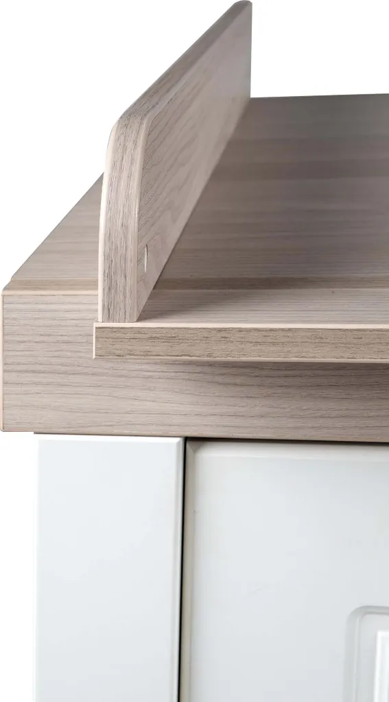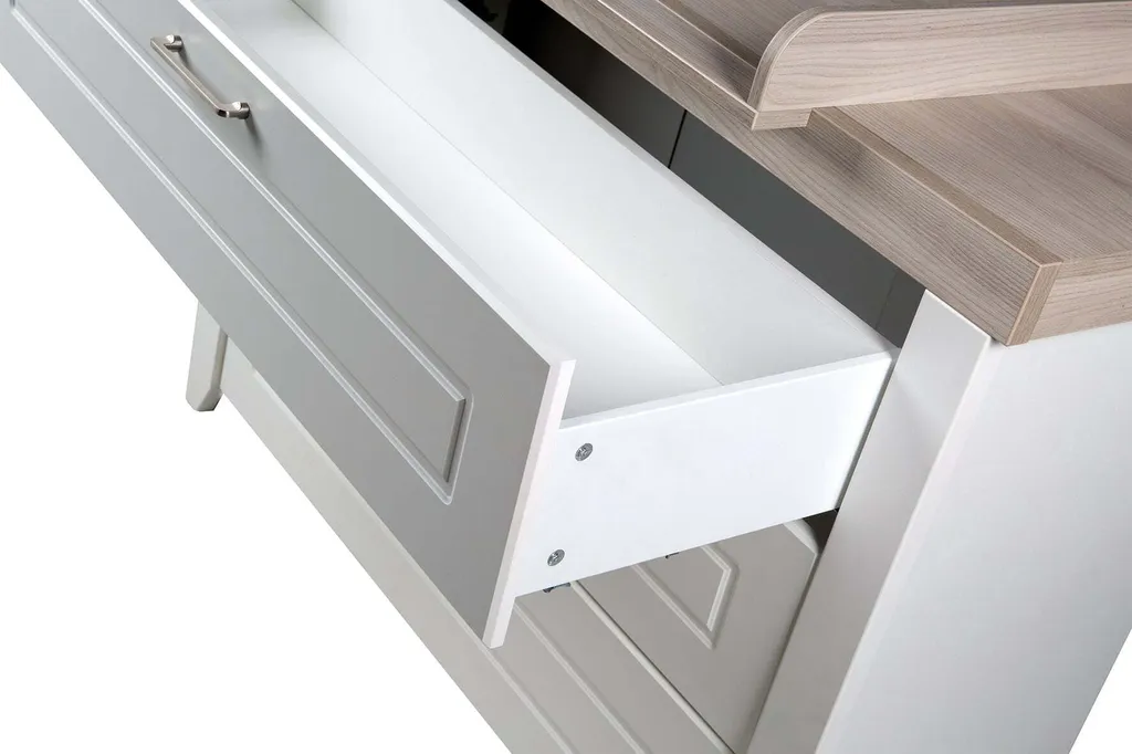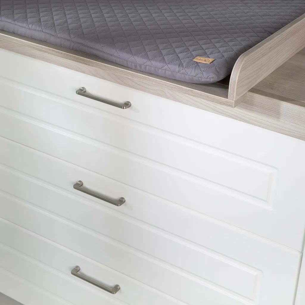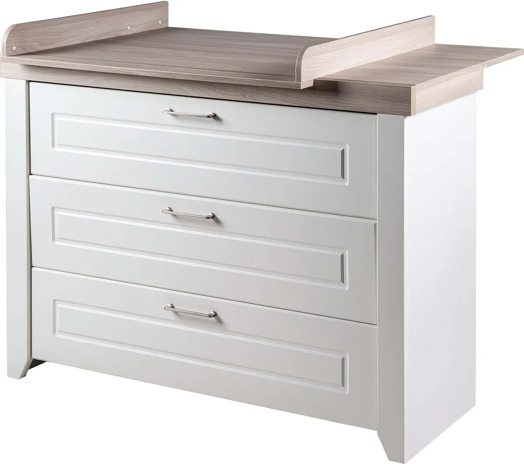 Die roba Wickelkommode mit Wickelansatz ‚Felicia‘ macht mit ihrer angenehmen Wickelhöhe von 90 cm die Babypflege für Eltern und Baby zum Vergnügen. Die gepolsterten roba Wickelauflagen in der Größe 85 cm x 75 cm verwandeln die Wickelkommode in einen kuscheligen Wickelplatz im Babyzimmer. Die Schubladen bieten Stauraum für Wickelutensilien, so haben Sie bei der Babypflege alles schnell griffbereit. Die roba Wickelkommode mit Wickelansatz ist ein wahres Multitalent und leistet Ihnen weitere Jahre gute Dienste. Die stabile Wickelkommode bietet sich als erhöhter Sitzplatz für Ihr Kindergartenkind an, damit Sie in einer bequemen Stehposition mühelos beim Anziehen helfen können. Später entpuppt sich der Wickelplatz als Kommode in Ihrem Wohn- oder Kinderzimmer. Die Wickelkommode mit edlen, silberfarbenen Metallgriffen und ohne sichtbare Schrauben zählt zu unseren breiten Varianten. Mit weiteren Kindermöbeln aus der Serie ‚Felicia‘ lässt sich ein komplettes, stilvolles Kinder- oder Babyzimmer einrichten. Die Wickelkommode ist in Deutschland entwickelt und entspricht den aktuellen Sicherheitsstandards nach EN 12221 – 1+2:2008 + A1:2013. Die Wickelkommode ‚Felicia‘ wurde in der EU produziert und ist montagefreundlich. (HxB): 98 x 120 cm, Tiefe mit/ohne Wickelansatz: 75/42 cm, Wickelhöhe 90 cm. Korpus imNachbildung ‚weiß‘ und Front imNachbildung ‚Canadian White‘. Deckplatte imNachbildung ‚Luna Elm‘.