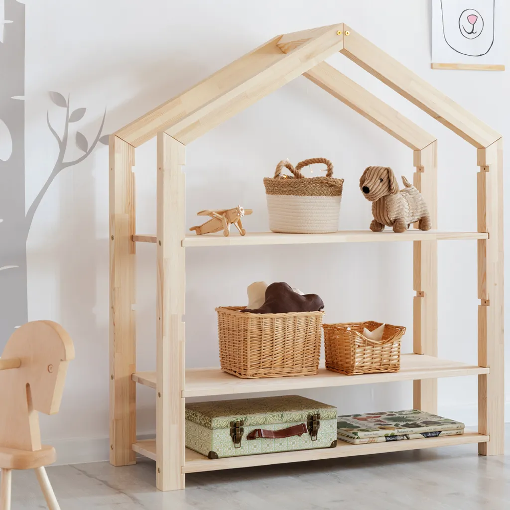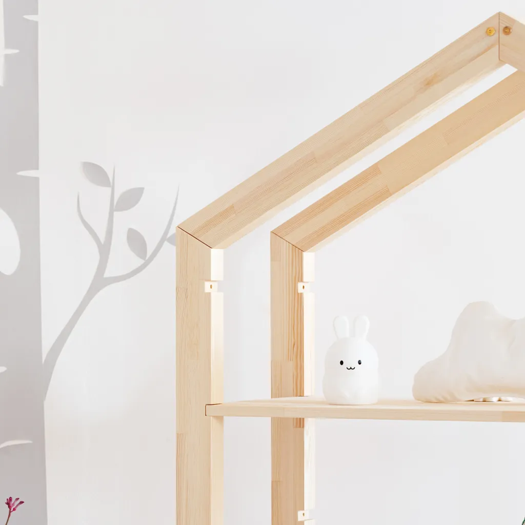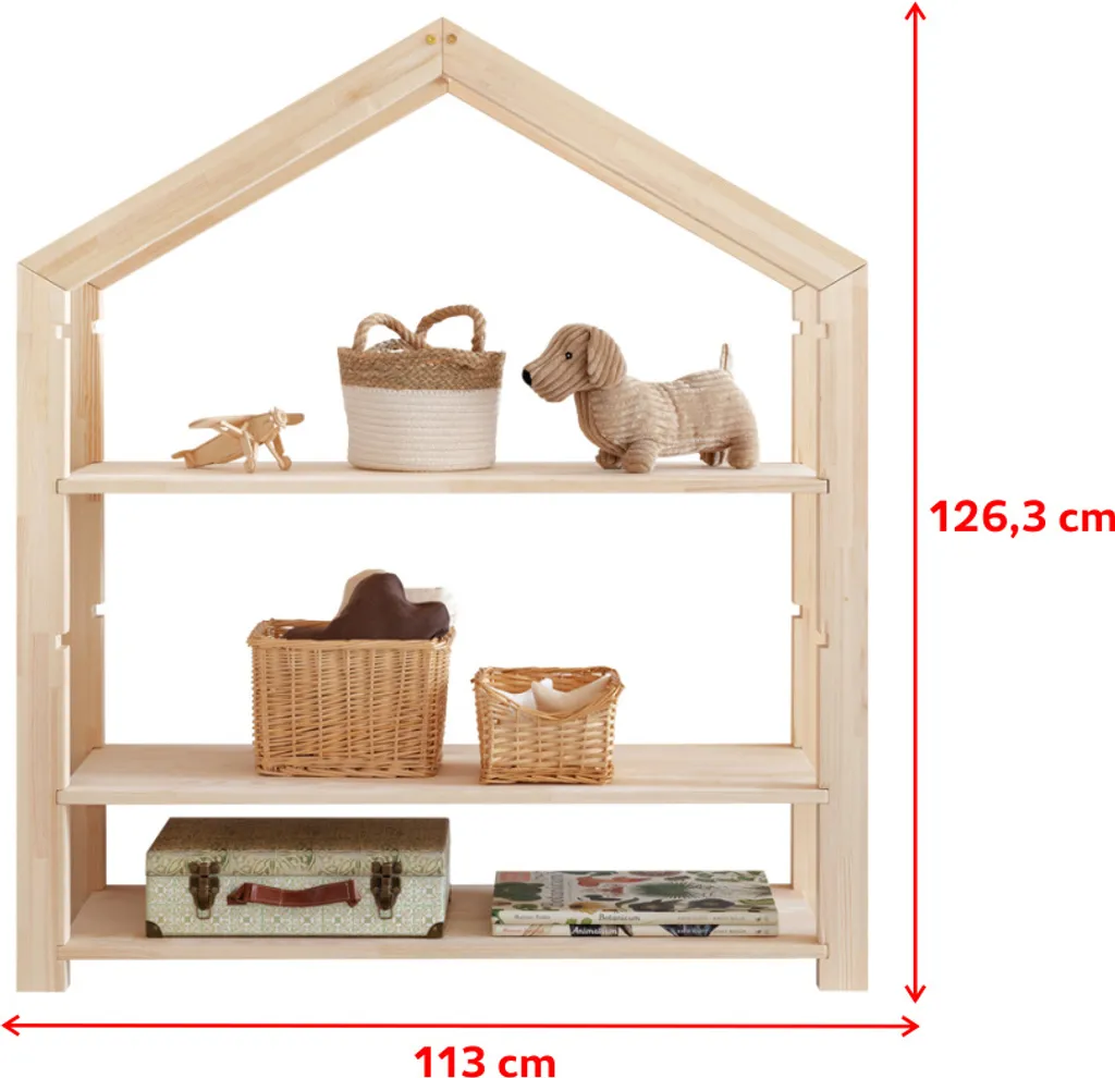 Das Regal JAFARI in Hausform aus Kiefernholz macht das Kinderzimmer gemütlicher und dient Ihrem Kind beim Präsentieren seiner schönsten Sachen. Die offenen Fächer sind leicht zugänglich und helfen den Überblick zu behalten, so findet der Kleine blitzschnell sein liebstes Buch oder Spielzeug.