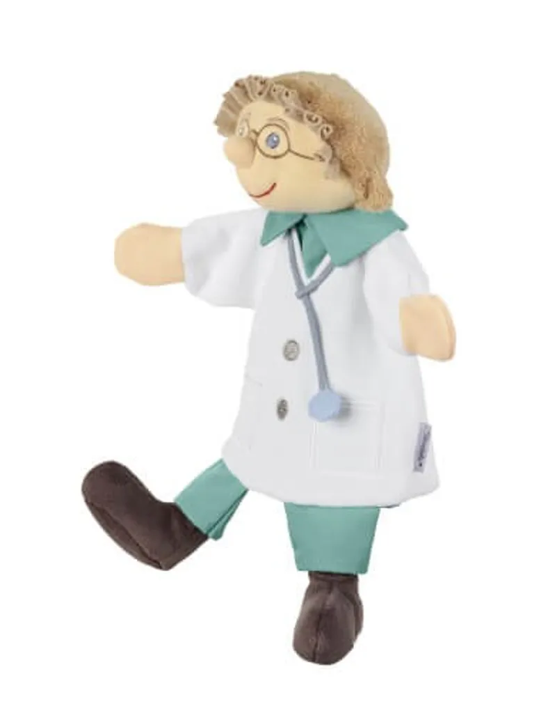 Die liebevolle Handpuppe Arzt aus Softvelour Gesichtsstoff und PolyBaumwolle bringt kleine Theatermacher auf fantastische Ideen…