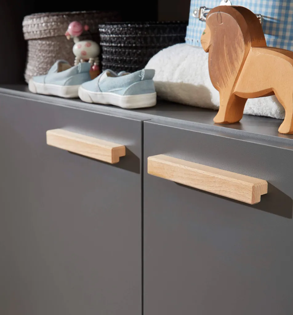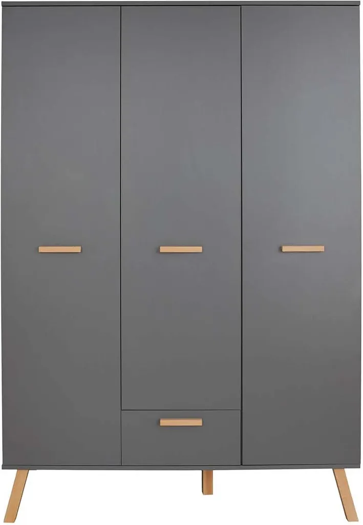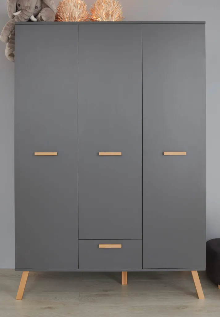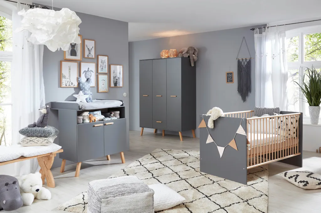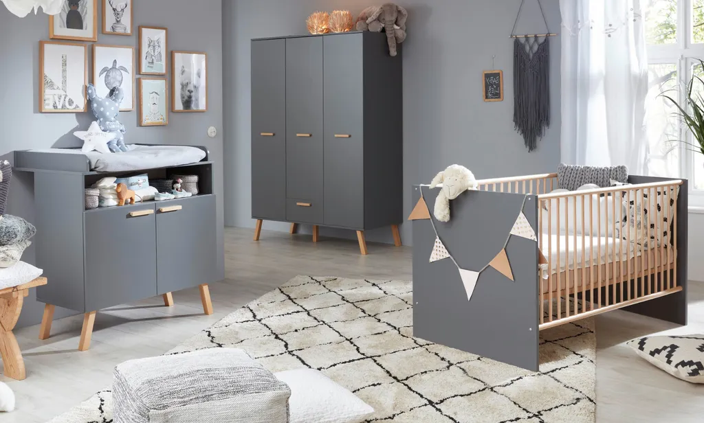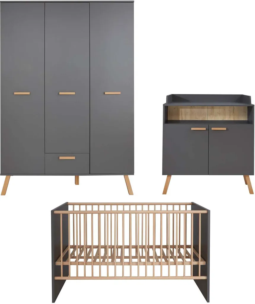 MATS 3-Zimmer-Babyzimmer, bestehend aus:, – einem 3-türigen Kleiderschrank mit 1 Schublade. Innen 2 Kleiderstangen und 5 Regale. Aus anthrazitgrauer Melamin-Spanplatte., Maße (BxHxT) 130 x 190 x 60 cm, – Ein Kinderbett zum Schlafen in 70 x 140 cm. Mit 3 abnehmbaren Stangen und verstellbarer Bettkastenhöhe in 3 Positionen. Aus anthrazitgrauer Melamin-Spanplatte und Massivholzleisten in Eiche natur lackiert., Maße (BxHxT): 144 x 83 x 78 cm, – Kommode mit Wickeltisch, 2 Türen, 1 große Nische. Aus anthrazitgrauer Melamin-Spanplatte., Wickelfläche: 85 x 75 cm, Maße (BxHxT) 96 x 105 x 78 cm