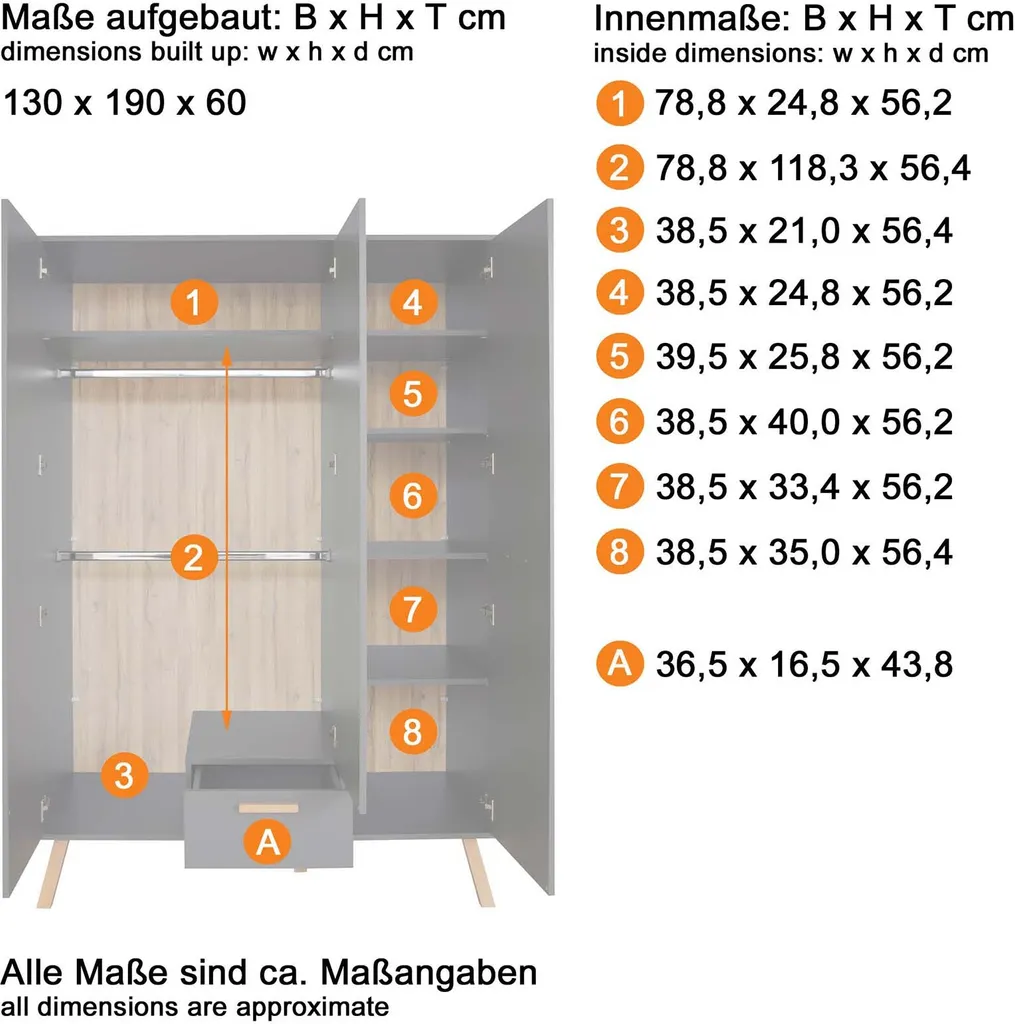 1x Kleiderschrank, B x H x T: ca. 130 x 190 x 60 cm