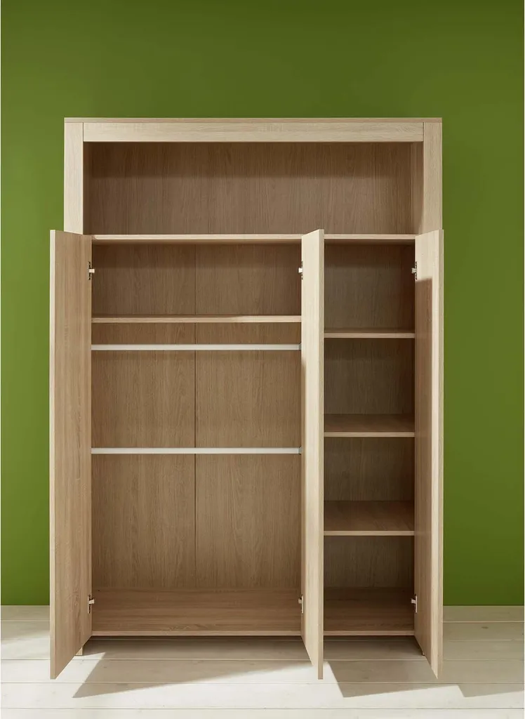 - Kleiderschrank: 3 Drehtüren, 1 offenes Fach, links 1 großer Konstruktionsboden, rechts 3 kleine Konstruktionsböden, links 2 Kleiderstangen