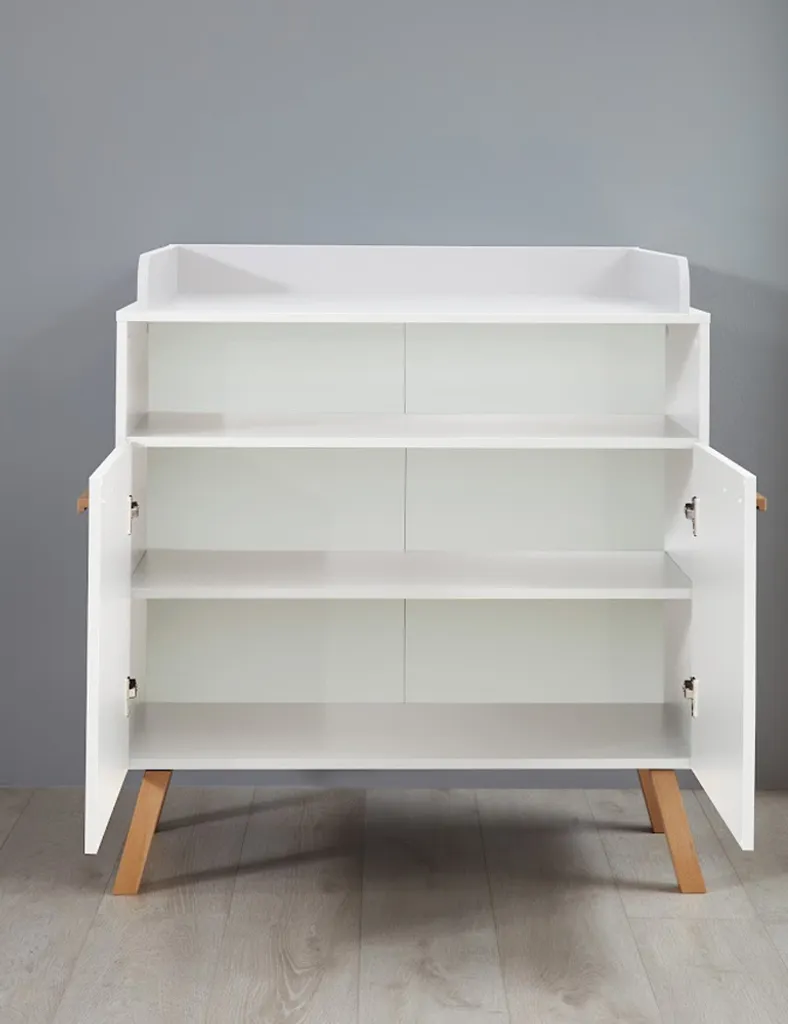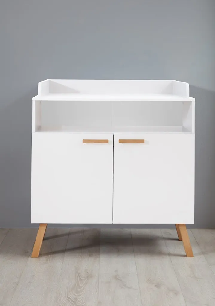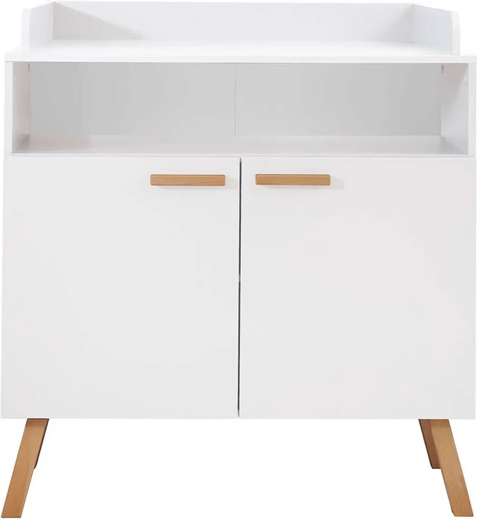 Front und Korpus in Melamin weiß, Griffe und Füße in Buch massiv honigfarben lackiert, mit GS – Siegel für die geprüfte Sicherheit, Außenmaße (Breite x Höhe x Tiefe) ca. 96 x 105 x 78 cm, abnehmbare Wickelplatte mit Wickelfläche ca. 85 x 75 cm. Ausstattung: 2 Türen, 1 offenes Fach, 1 Einlegeboden. Alle Möbelteile sind zerlegt und werden Kartonverpackt geliefert. Eine leicht umzusetzende und ausführliche Aufbauanleitung liegt bei. Ohne Auflage und Dekoration.