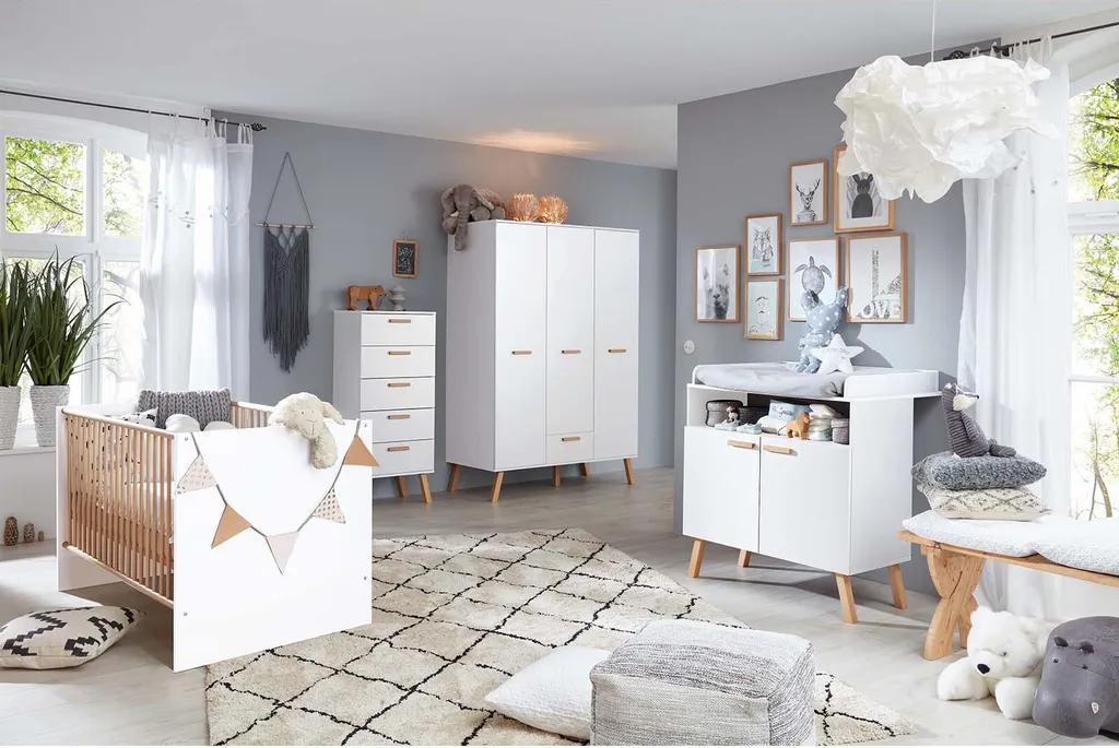Das Babyzimmer Mats ist ein schönes und helles Babyzimmer wo sich Ihre Kleinen von Anfang an wohlfühlen werden. Durch sein neuteales Design bietet es sich für Jungen und Mädchen an. Die Wickelkommode lässt sich später als Kommode im Kinderzimmer nutzen.