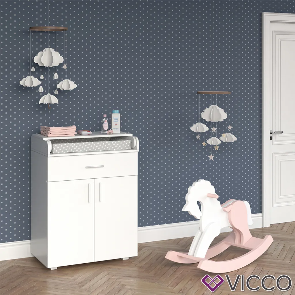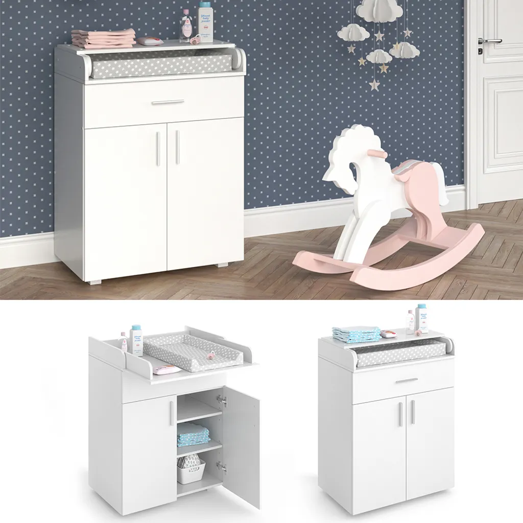 Innerhalb der praktischen Schublade und der beiden Drehtüren ist viel Stauraum für Babyutensilien vorhanden.