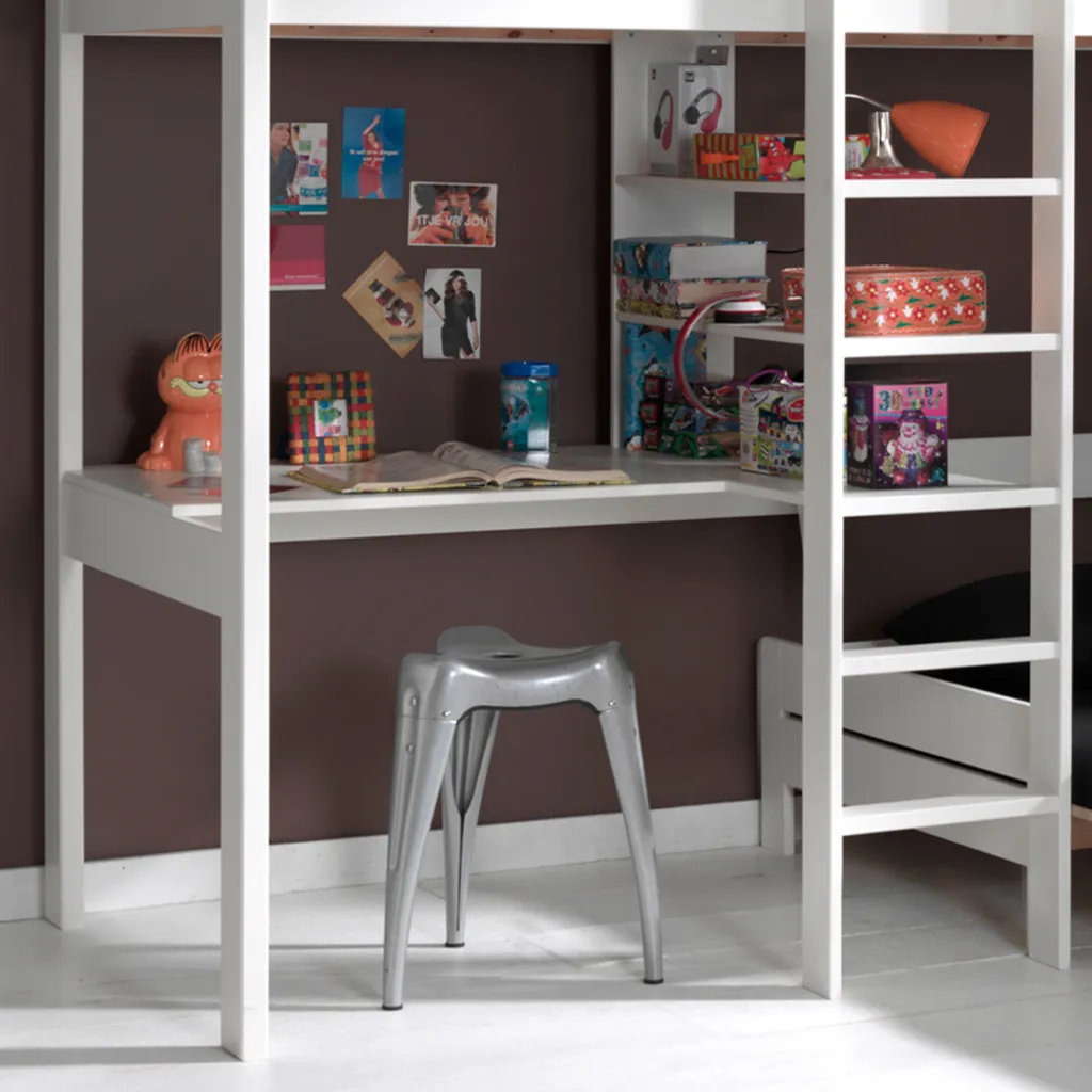 - Funktionelles Hochbett in Weiß mit Eckschreibtisch und ausziehbaren Sessel.